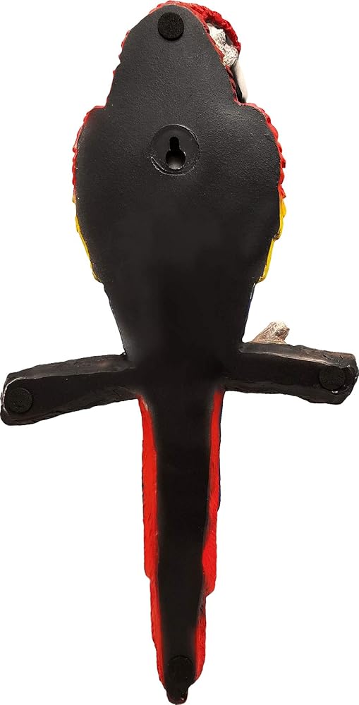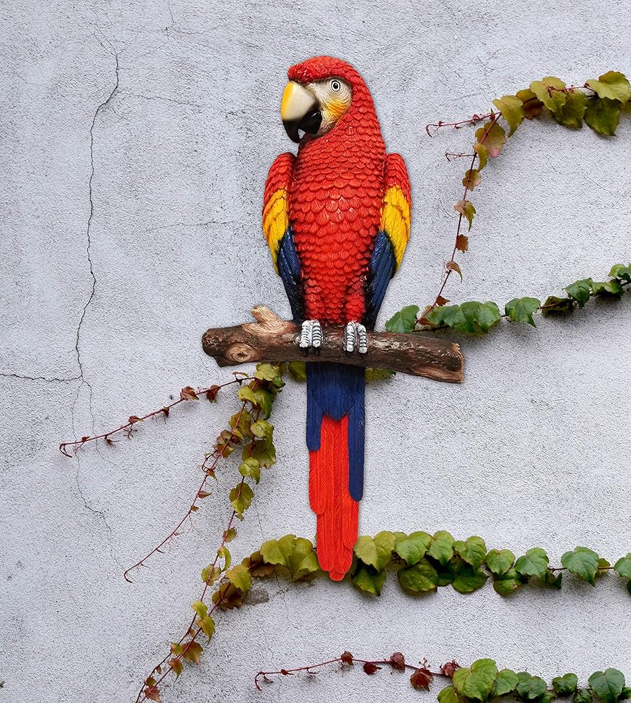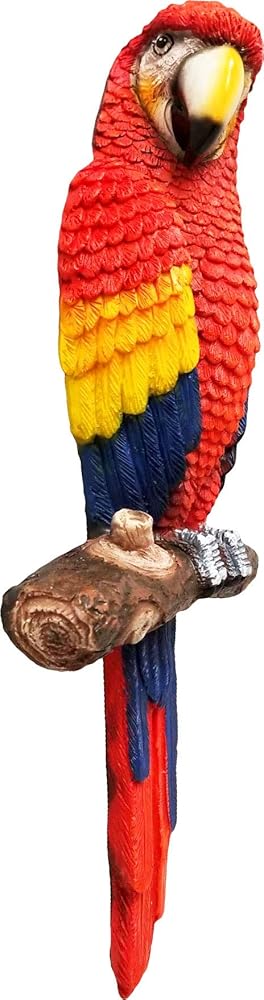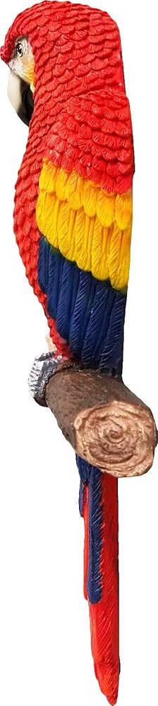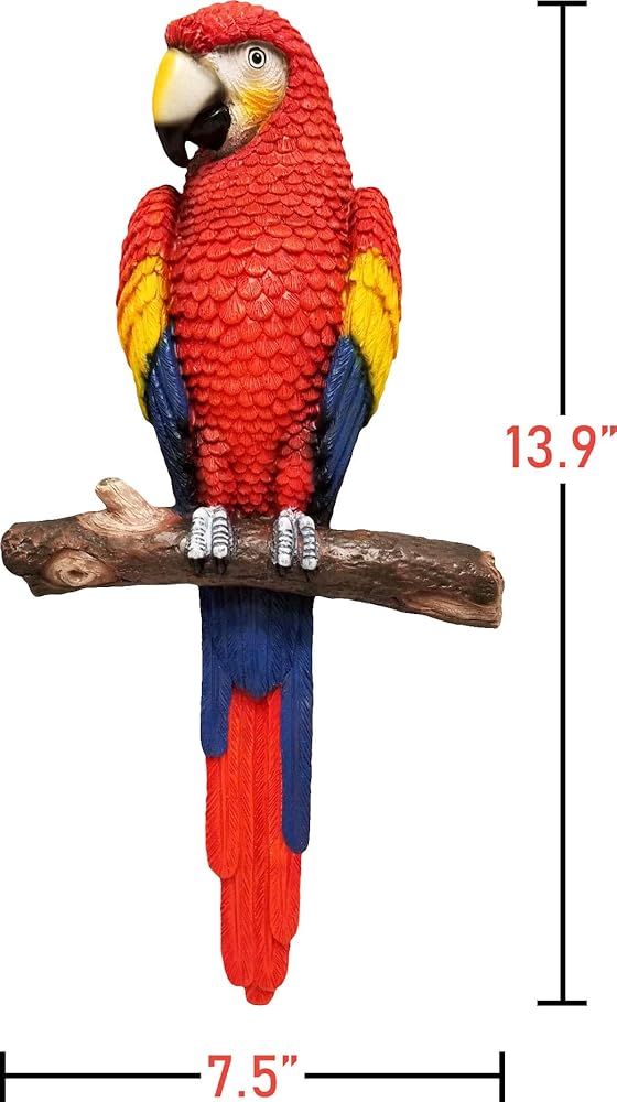 Bring a tropical vibe to your space with this perched parrot wall sculpture that looks almost like the real thing. If you love the tropical look and bright colors, this parrot is what you are looking for. The bird sits quietly perched on a piece of branch, and a built-in keyhole mounting hanger on the back lets you easily display it on any wall. Give any room a beautiful new look with this 14 inch high, 6.75 inch long, 2.25 inch wide cast resin parrot wall hanging.