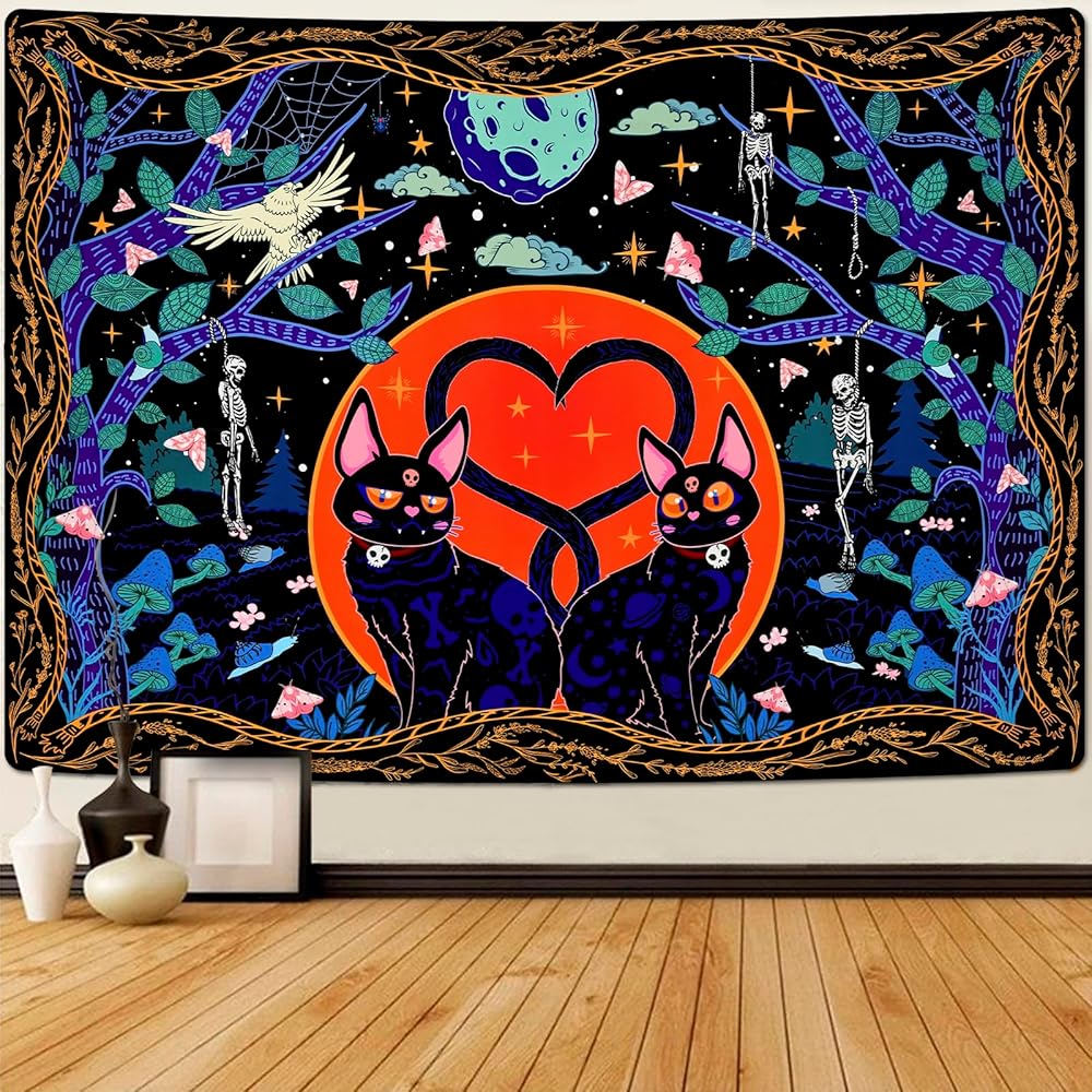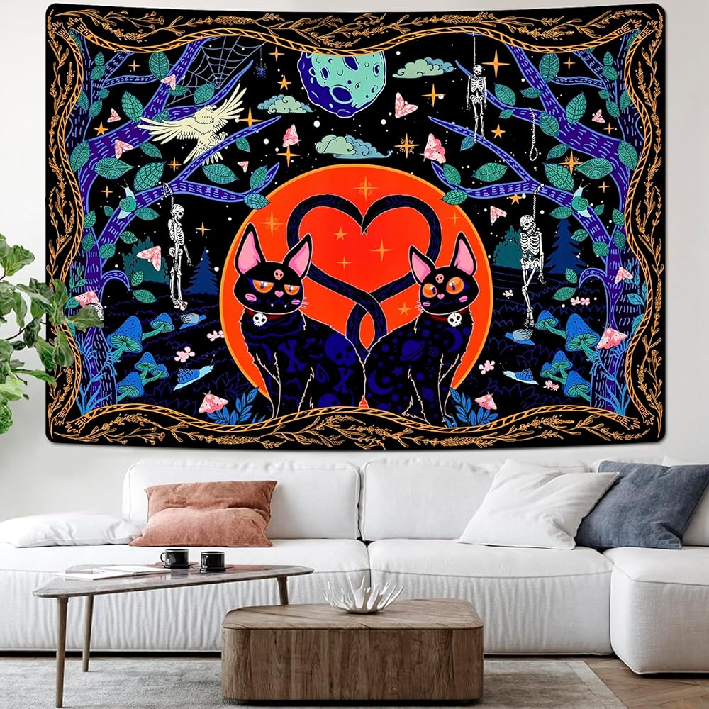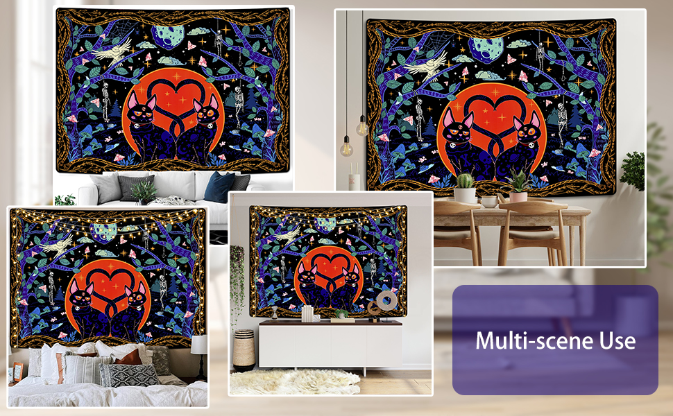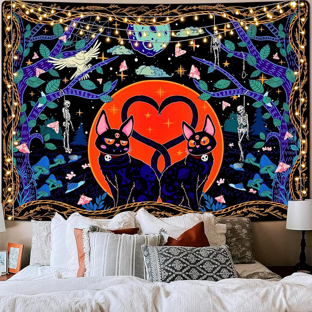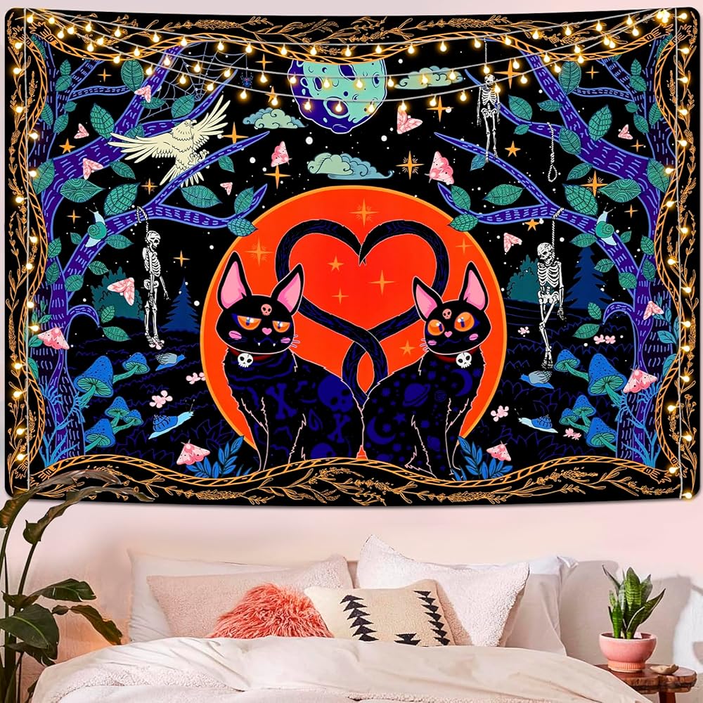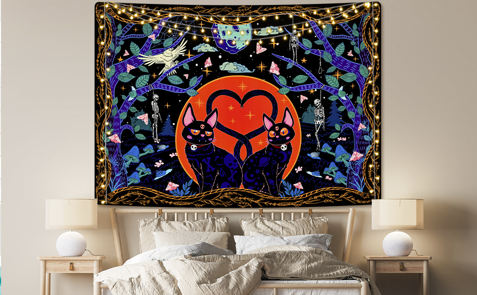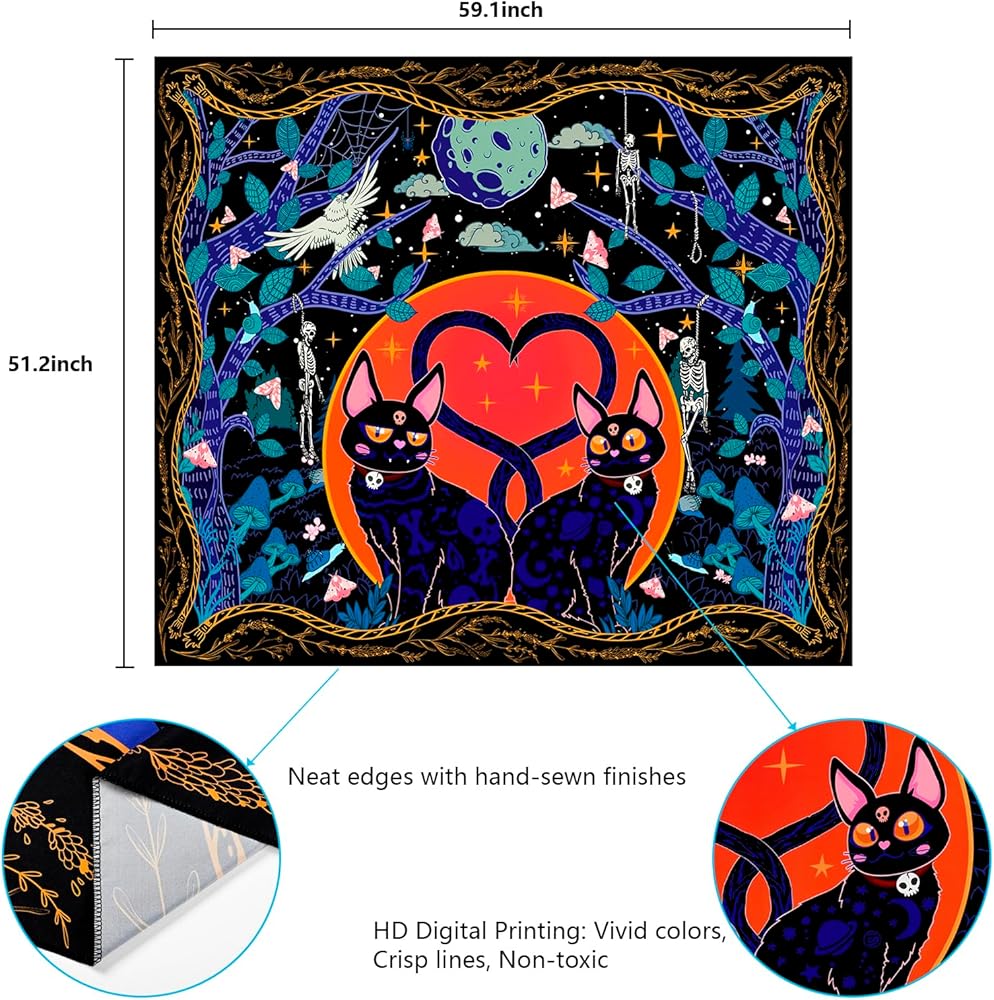 تصميم فريد: يتميز النسيج القوطي بتصميم فريد من نوعه مع نمط مخدر من الجمجمة والقمر والقطط اللطيفة والنجوم وأكثر من ذلك، مما يخلق مظهرًا جذابًا يضيف لمسة من الغموض والإثارة إلى أي غرفة.
