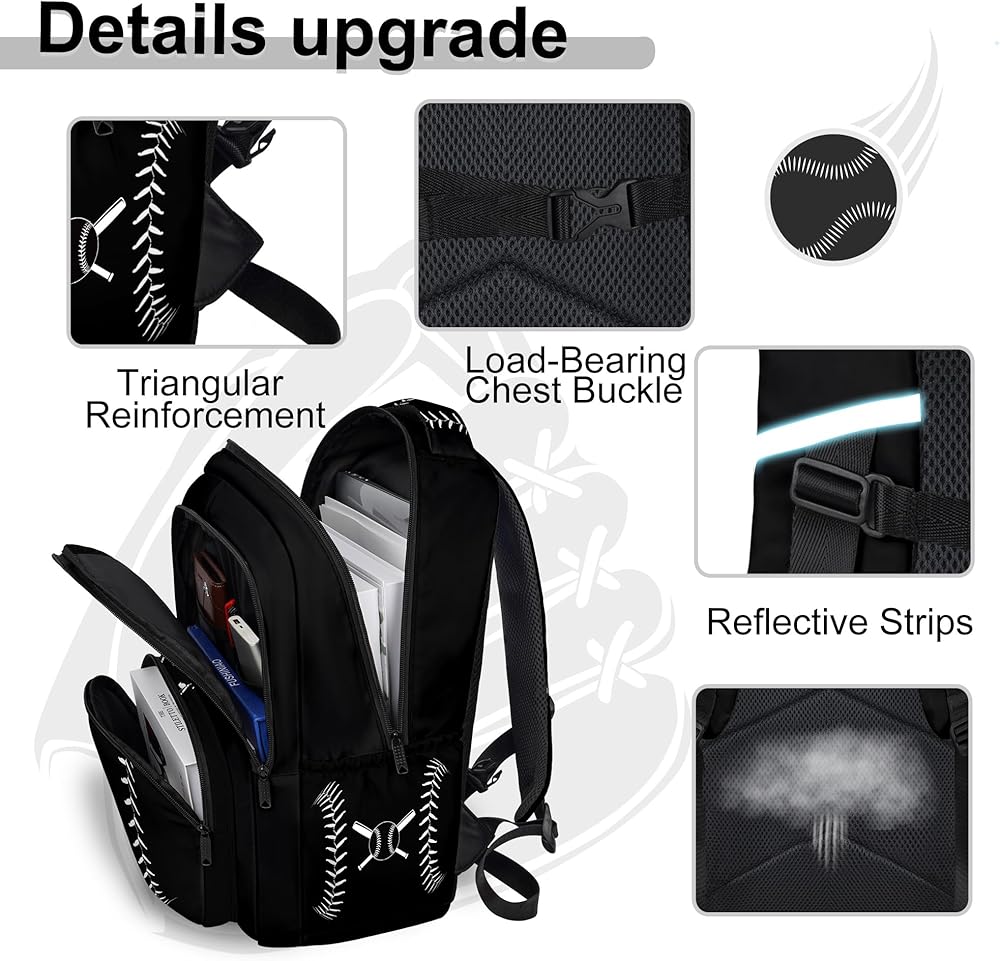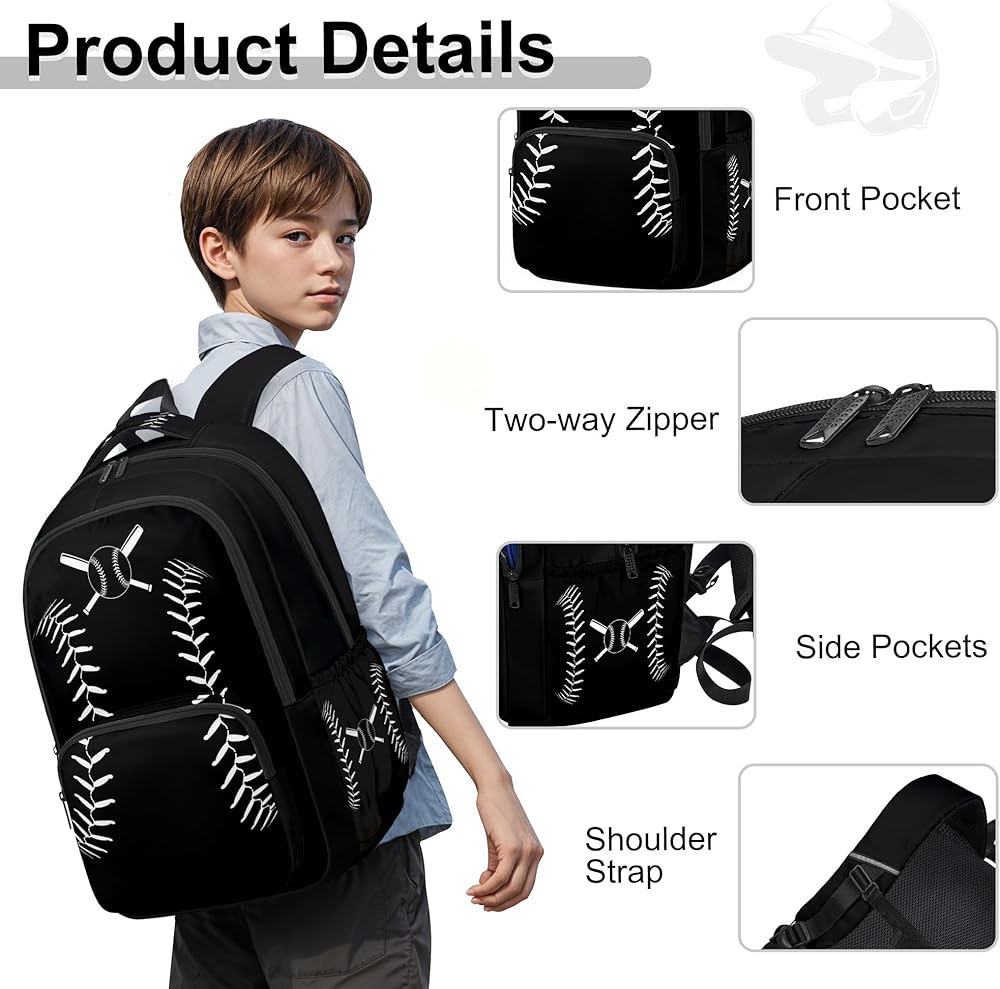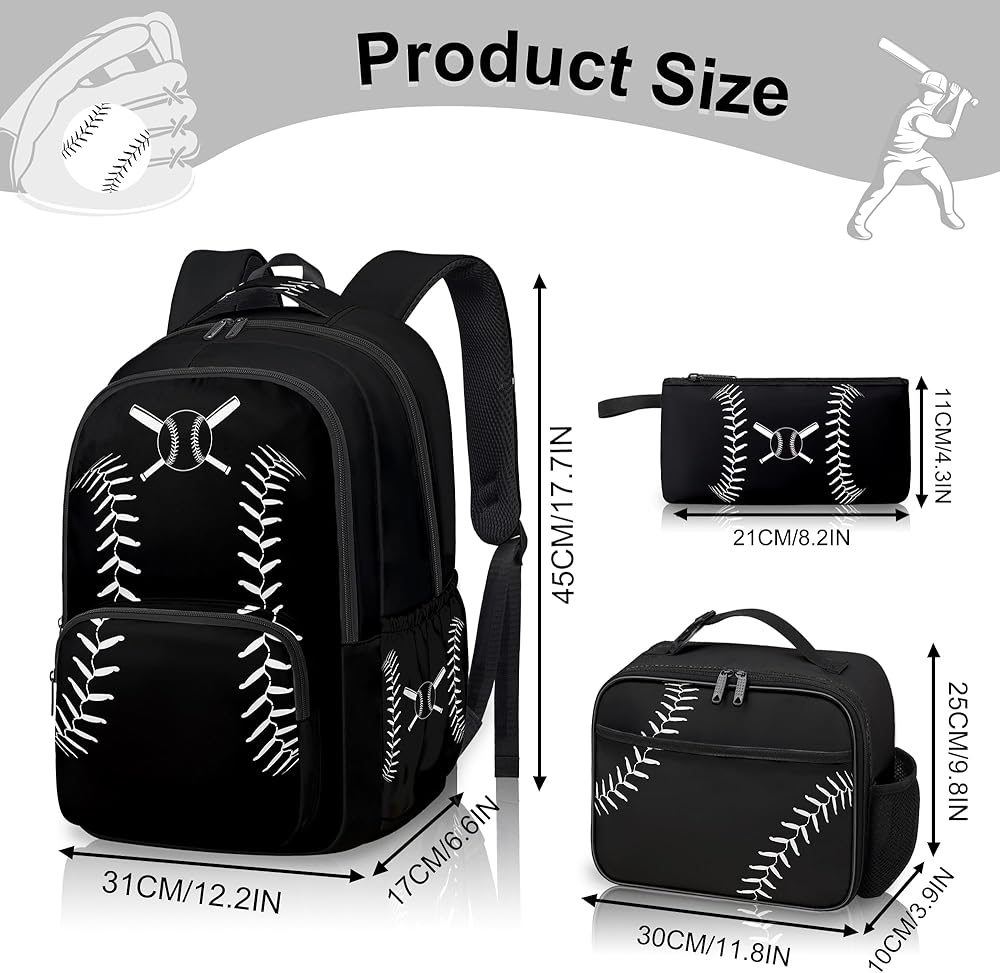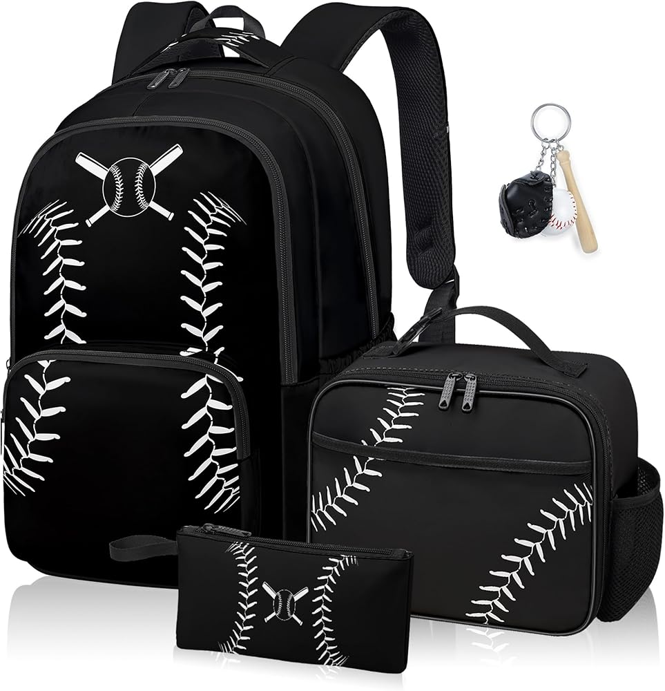 حقيبة ظهر بيسبول للأولاد، حقيبة ظهر بيسبول للأطفال للمدرسة، مجموعة حقائب كتب مقاس 17 بوصة مع حقيبة غداء وحقيبة أقلام وسلسلة مفاتيح باللون الأسود