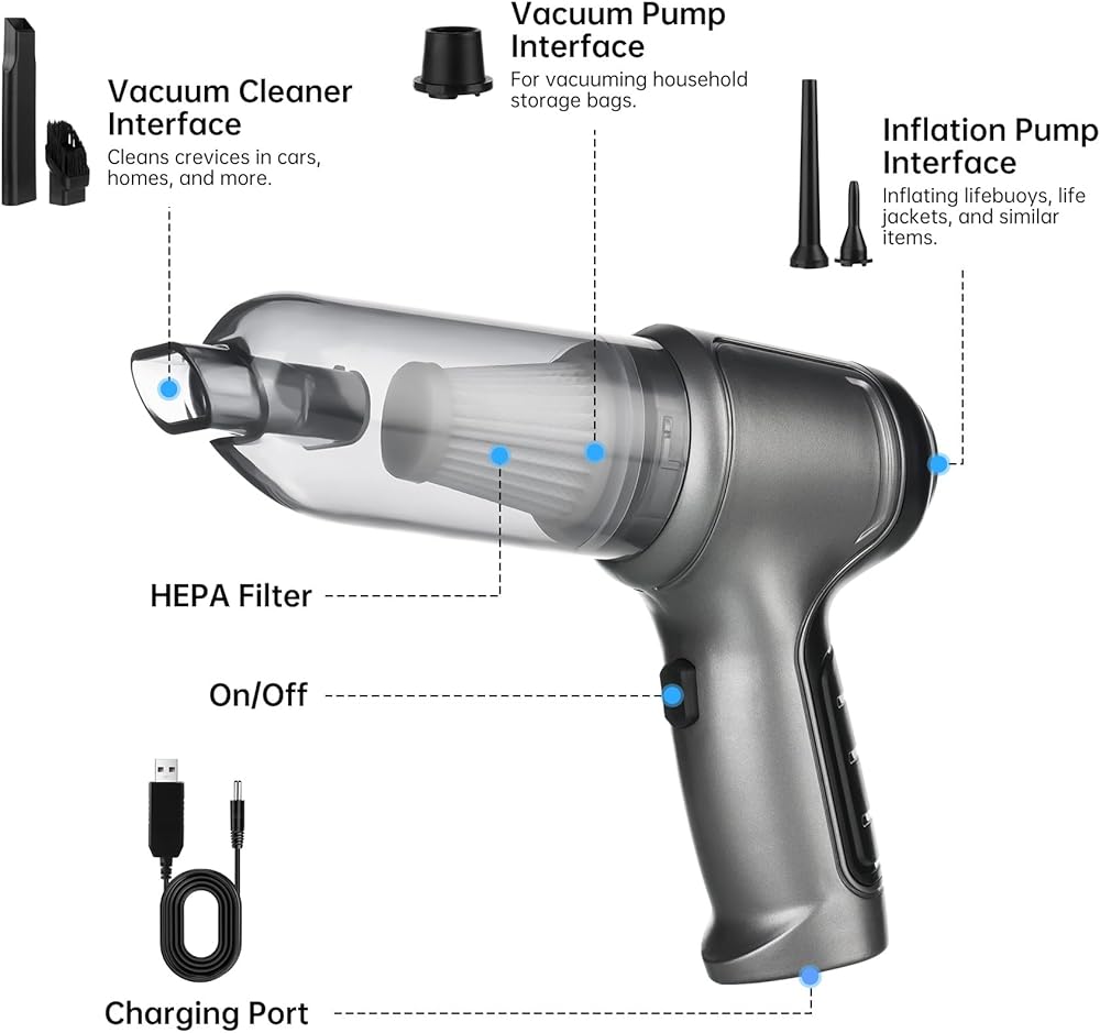 ✅ Choose From Four Attachments: A suction nozzle for doors and drawers; a dual-purpose brush for cushions and keyboards; a blowing port at the back for inflating items like life buoys; and a front pumping port for household storage bags.