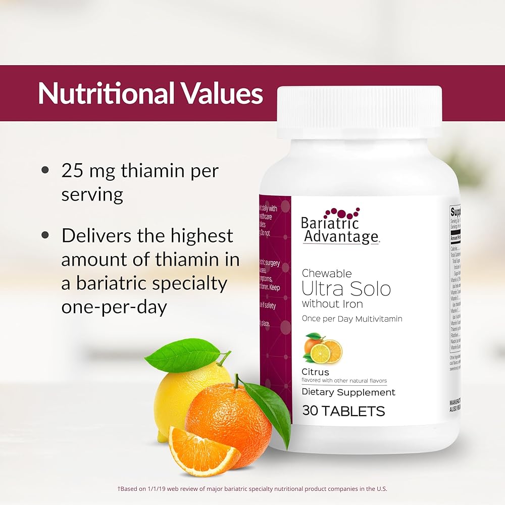 Now available from Bariatric Advantage – Ultra Solo. Our new once-per-day multivitamin is specifically formulated to help meet gastric sleeve and bypass patients' vitamin and mineral needs. Ultra Solo has the highest amount of thiamin in a bariatric specialty once-per-day multivitamin.* Designed especially for bariatric patients and formulated with bioavailability in mind. Available with or without iron in chlorophyllin-colored capsules of vegetarian origin. Each capsule contains: 25 mg thiamin 45 mg iron (from iron fumarate; with iron option only) 3,000 IU vitamin D (from cholecalciferol) 500 mcg vitamin B12 (from methylcobalamin) (Complete supplement facts listed below) *Based on 1/1/19 web review of major bariatric specialty nutritional product companies in the U.S.