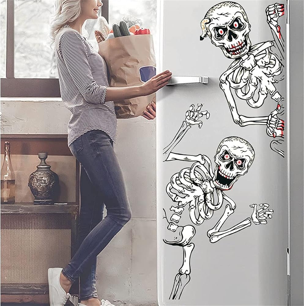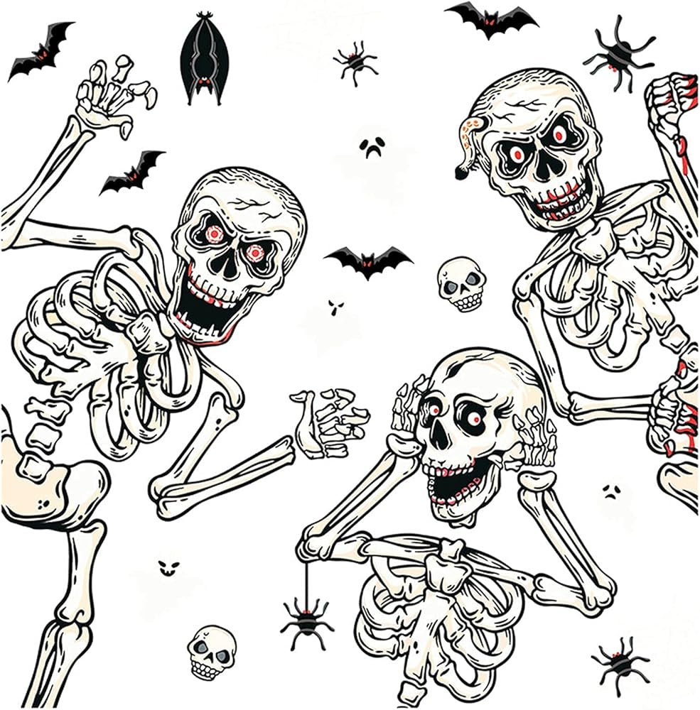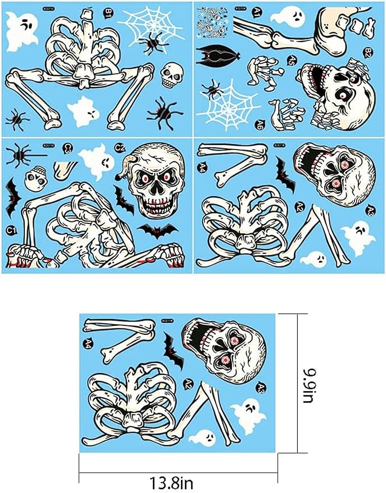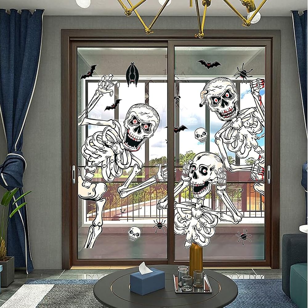 • ملصق نافذة الجمجمة: يأتي مع ملصقات نافذة الجمجمة مع الخفاش والأشباح والهيكل العظمي في إجمالي 4 أوراق، إنها طريقة مثيرة للاهتمام لإضافة الديكور المخيف في منزلك.