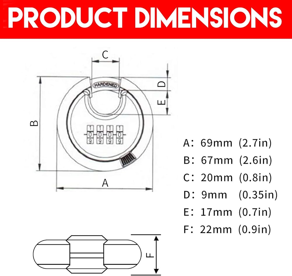 【Specficatons】The discus lock body is 2.66 in wide, and the shackles diameter is 0.35 in