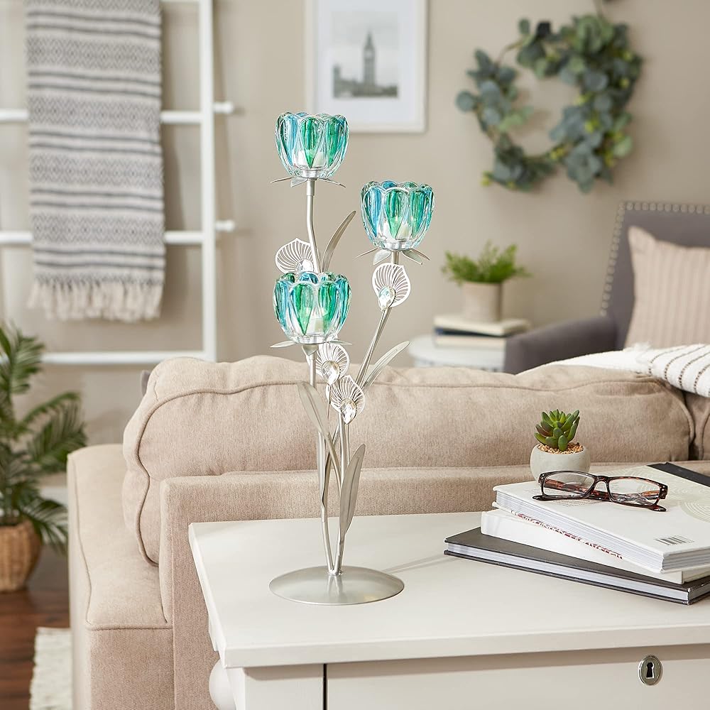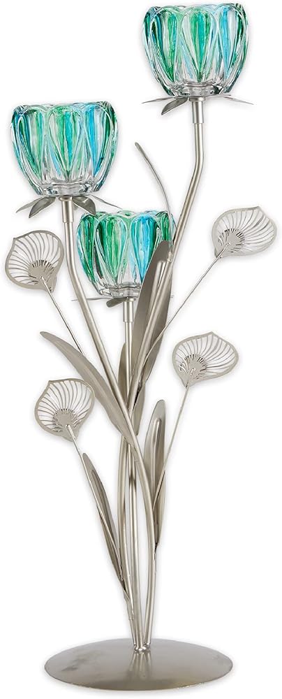 • [HIGH QUALITY]: The amazing detail adds dimension. Made from sturdy iron, glass and plastic to create a uniquely ornate home embellishment that is both beautiful and functional. The iron base features three winding stems that reach up to hold three blooms that feature the gorgeous colors of a proud peacock. The candleholder weighs 1.4 lbs. and measures 7 inches by 5.25 inches by 18.5 inches. Candles not included.