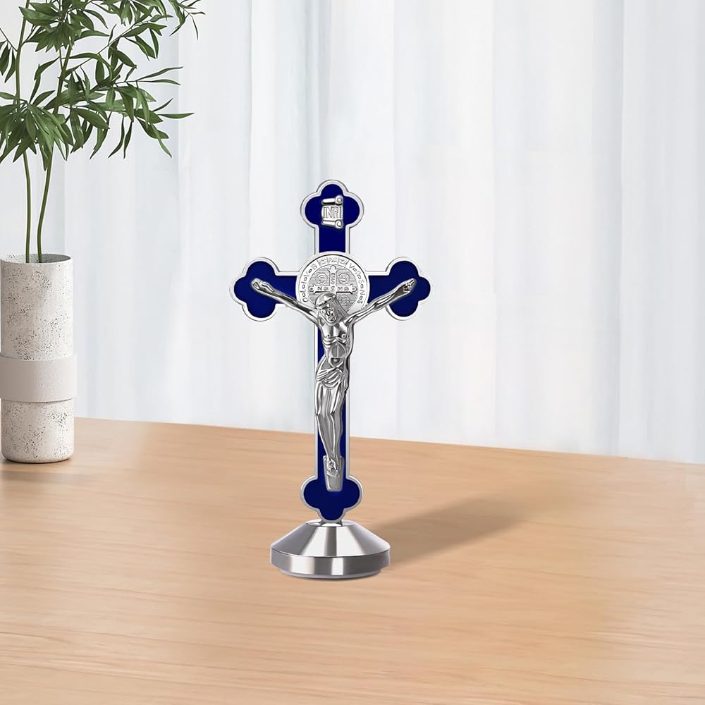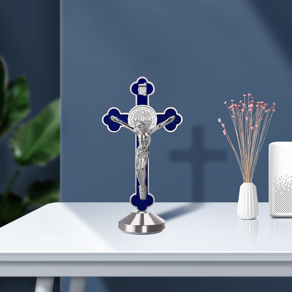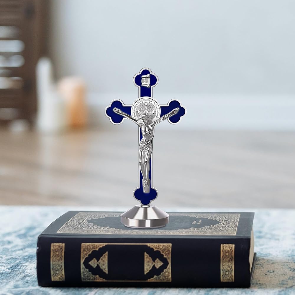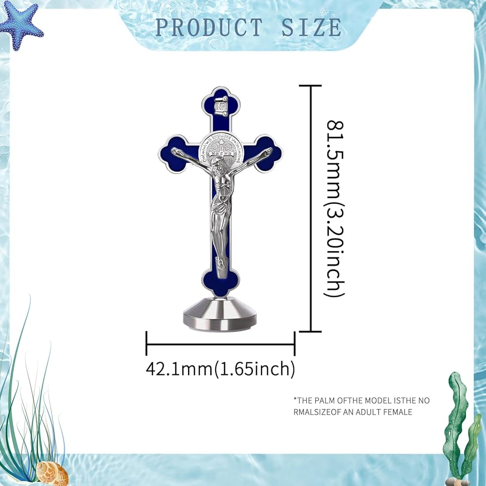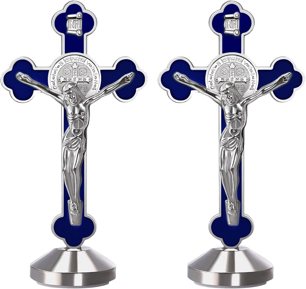 قطعتان من صليب المينا المعدني مقاس 7.62 سم يتوهج في الظلام وسام القديس بنديكت صليب الحائط هدايا دينية، ملصق في الأسفل للالتصاق على سطح الطاولة، أو مذبح السيارة أو المنزل (أزرق)