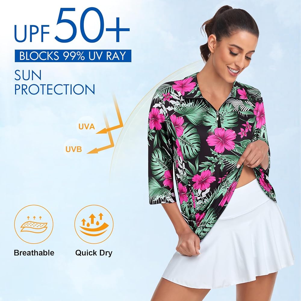 المواد: قمصان الجولف النسائية مصنوعة من نسيج رياضي ماص للرطوبة وواقي من الشمس. خفيف الوزن ومسامي، سريع الجفاف، تصميم فضفاض يتمدد في 4 اتجاهات يبقيك منتعشًا وجافًا طوال اليوم.