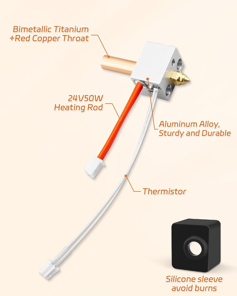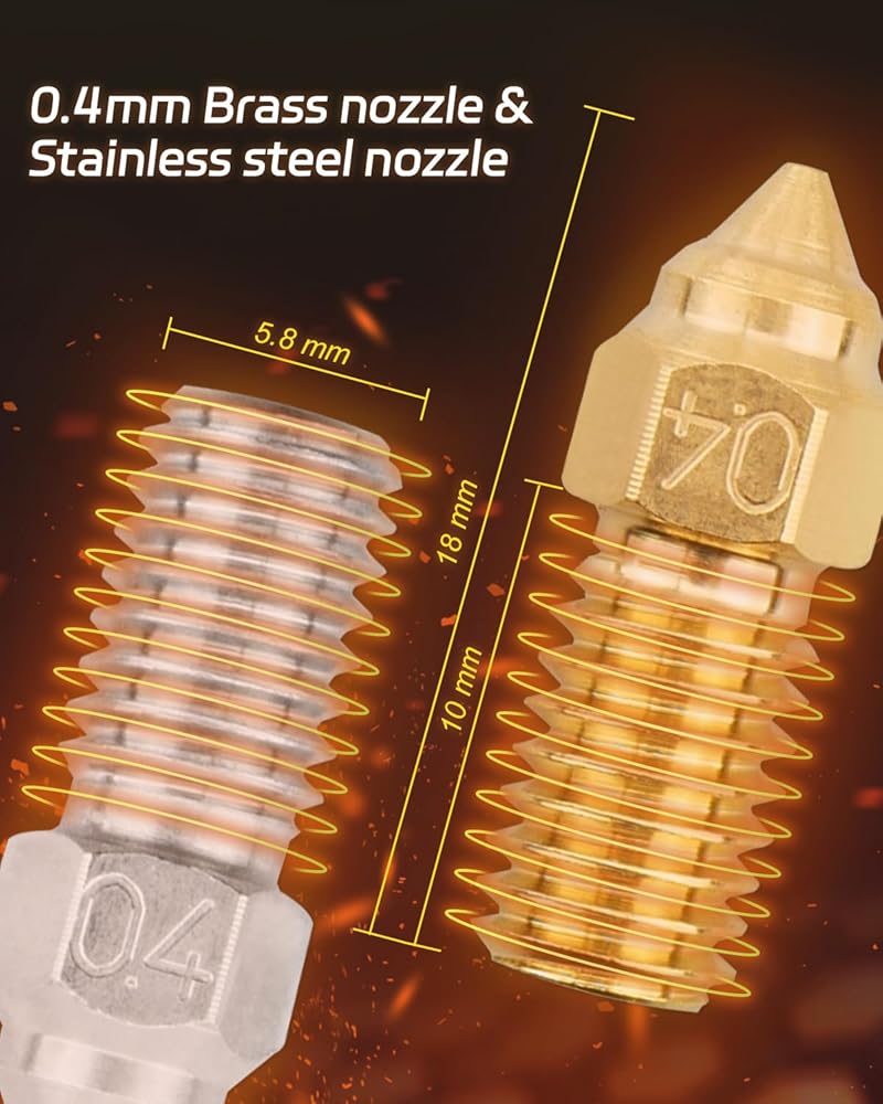اختيار الفوهة من مواد مختلفة: تم تجهيز المسخن المعدني بالكامل مع الفوهة بفوهتين من النحاس وفوهتين من الفولاذ المقاوم للصدأ. يمكن اختيار فوهات مختلفة وفقًا للمواد الاستهلاكية المختلفة للطابعة، وهو أمر مفيد في تقليل فقدان الفوهة.