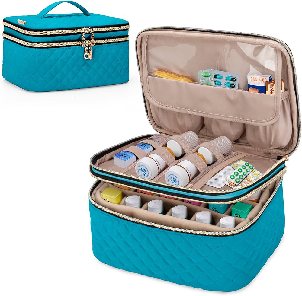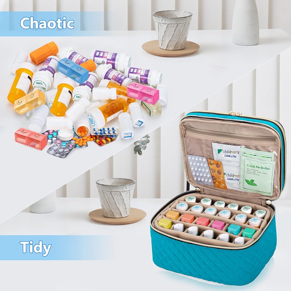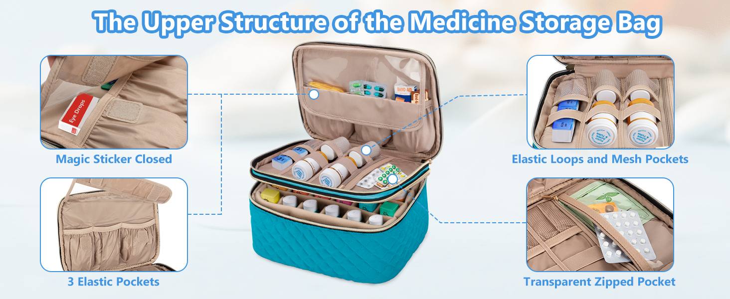 الطبقة الثانية - مجهزة بفاصل قابل للتعديل والفصل يحمل ما يصل إلى 24 زجاجة حبوب (أقل من 3.7 بوصة). 1 جيب شفاف كبير جدًا بسحاب لتخزين وسادات الكحول والأقنعة الطبية والقفازات الطبية وأكياس الثلج وما إلى ذلك.