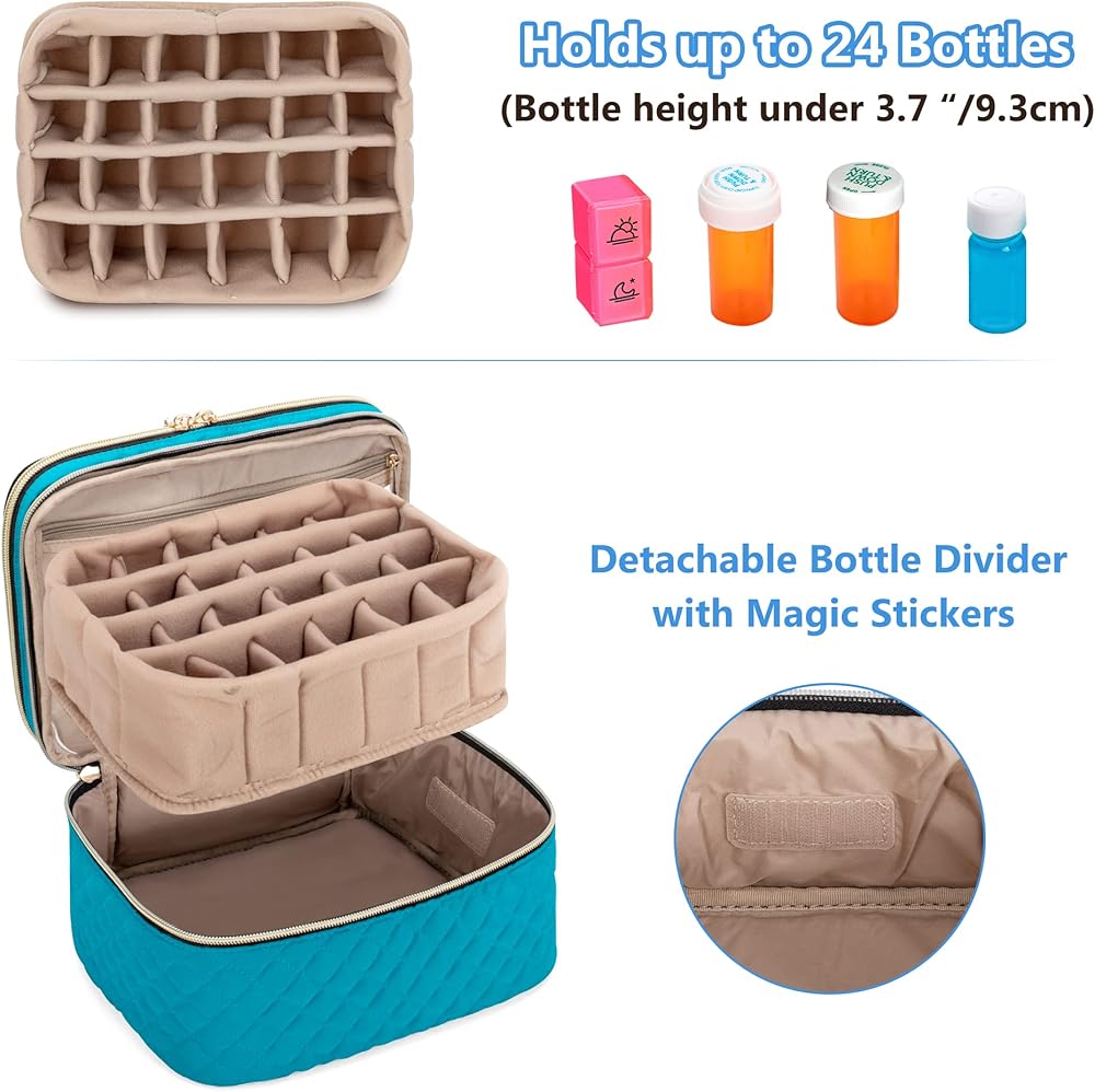سعة كبيرة - تصميم فريد مزدوج الطبقة يلبي الاحتياجات المختلفة للتخزين الطبي. ستحافظ حقيبة تنظيم الأدوية هذه على تنظيم جميع أغراضك في مكان واحد. (الحقيبة فقط، الزجاجات غير متضمنة)