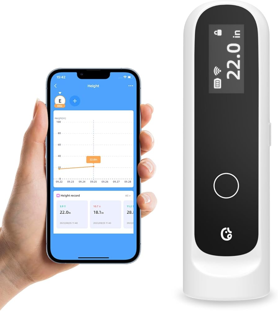 قياس الارتفاع الذكي عالي الدقة من ELLIE للأطفال - تصميم لاسلكي محمول على الحائط مع شاشة LCD مع تطبيق لتتبع الارتفاع وإدارة البيانات