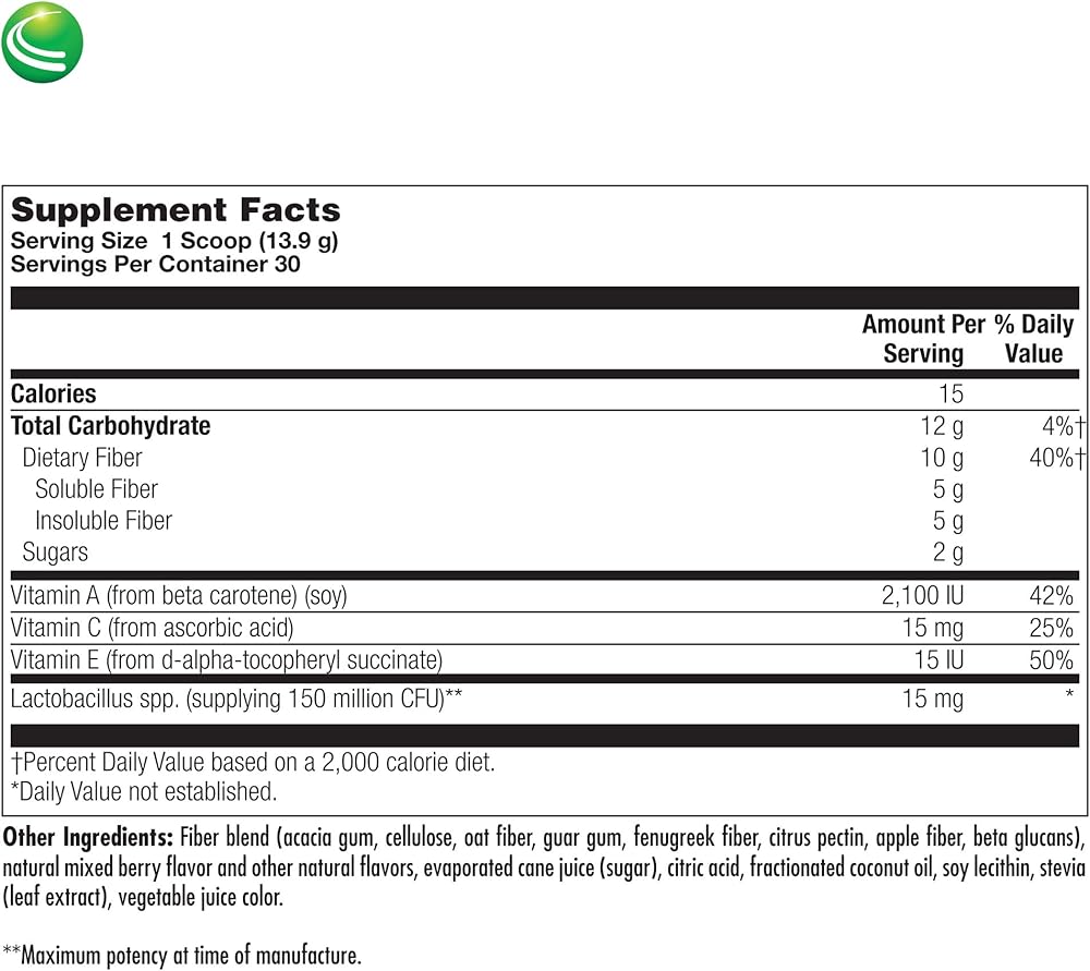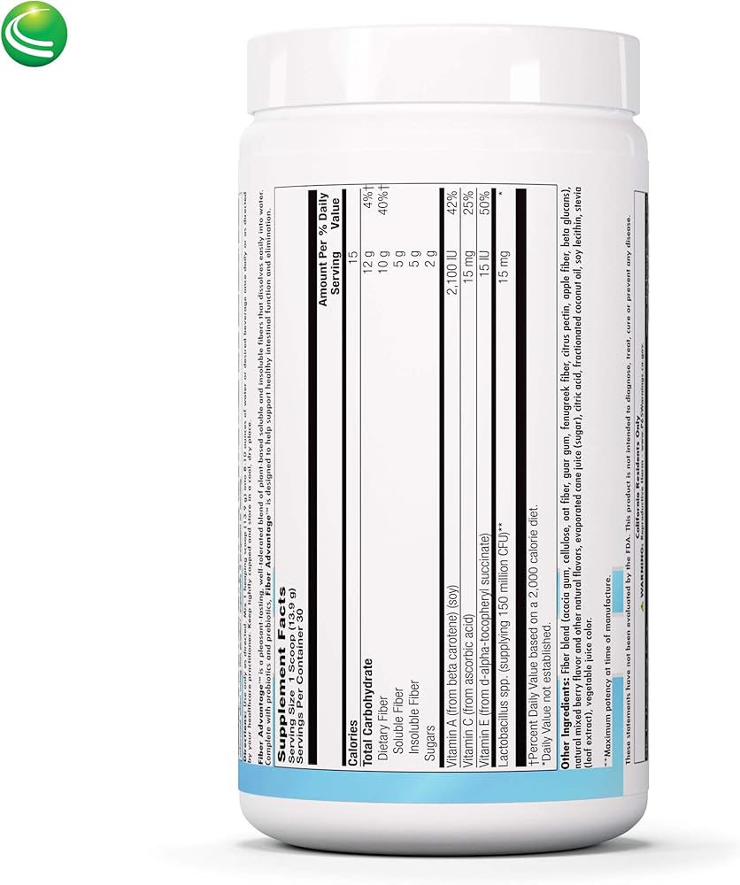 • توفر كل حصة تحتوي على 15 سعرة حرارية 5 جرام من الألياف القابلة للذوبان و5 جرام من الألياف غير القابلة للذوبان، مكتملة بالبروبيوتيك والبريبايوتكس، تتميز Fiber Advantage بـ 8 أنواع من الألياف لتوفير الدعم الغذائي لانتظام الأمعاء الصحي وللمساعدة في الحفاظ على وظيفة الأمعاء الصحية.