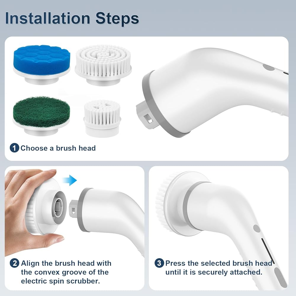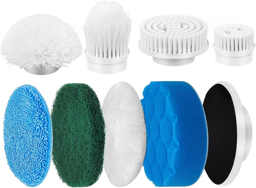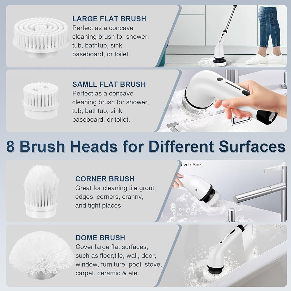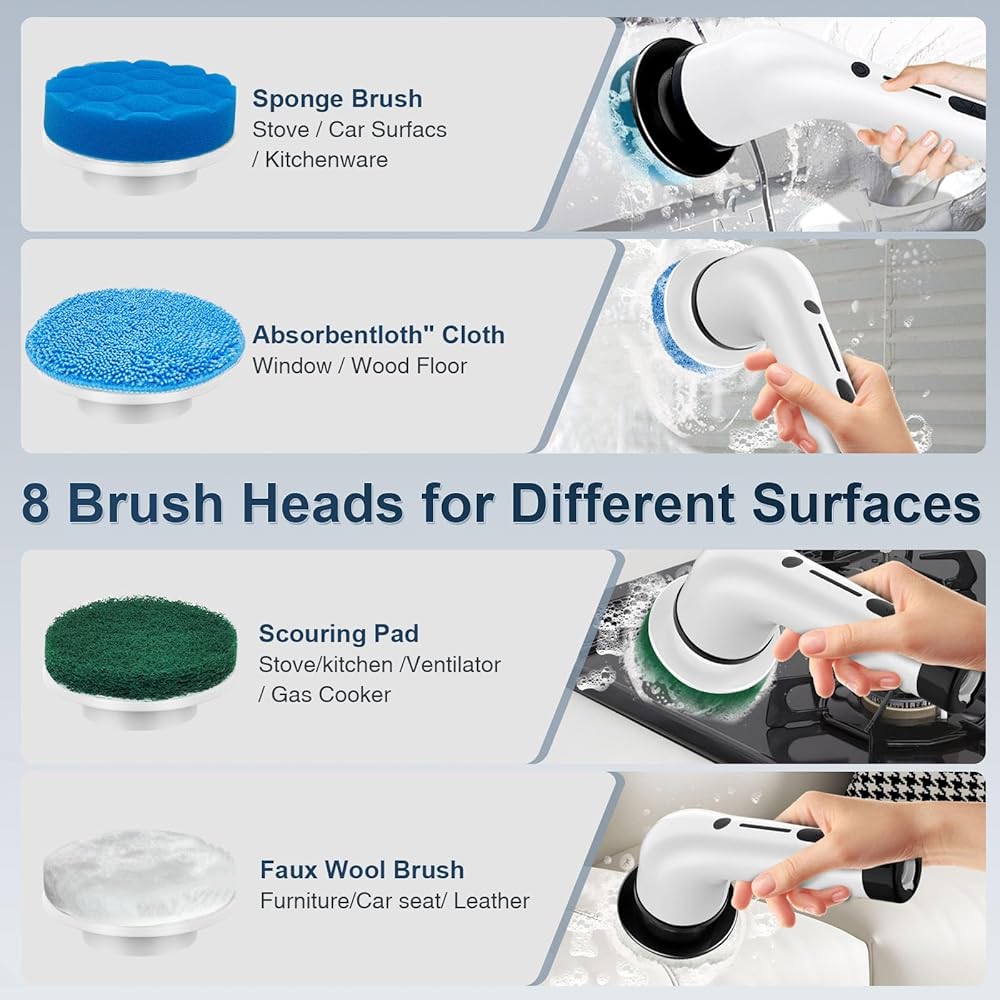 مجموعة رؤوس فرشاة متعددة الاستخدامات: تتضمن 8 رؤوس فرشاة متخصصة، كل منها مصمم لسيناريوهات تنظيف مختلفة، ومناسبة لمجموعة متنوعة من الأسطح مثل البلاط، والخشب، والجدران، وحمامات السباحة، والصنابير، والحواف، والأثاث، والنوافذ، والمواقد، والمغاسل، والأجزاء الخارجية للسيارة، محاور العجلات.