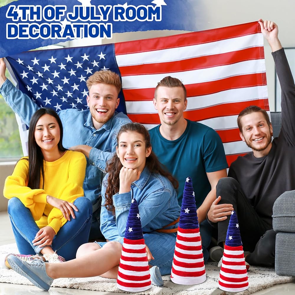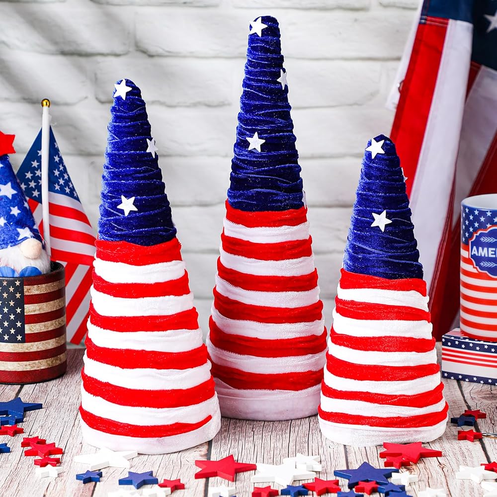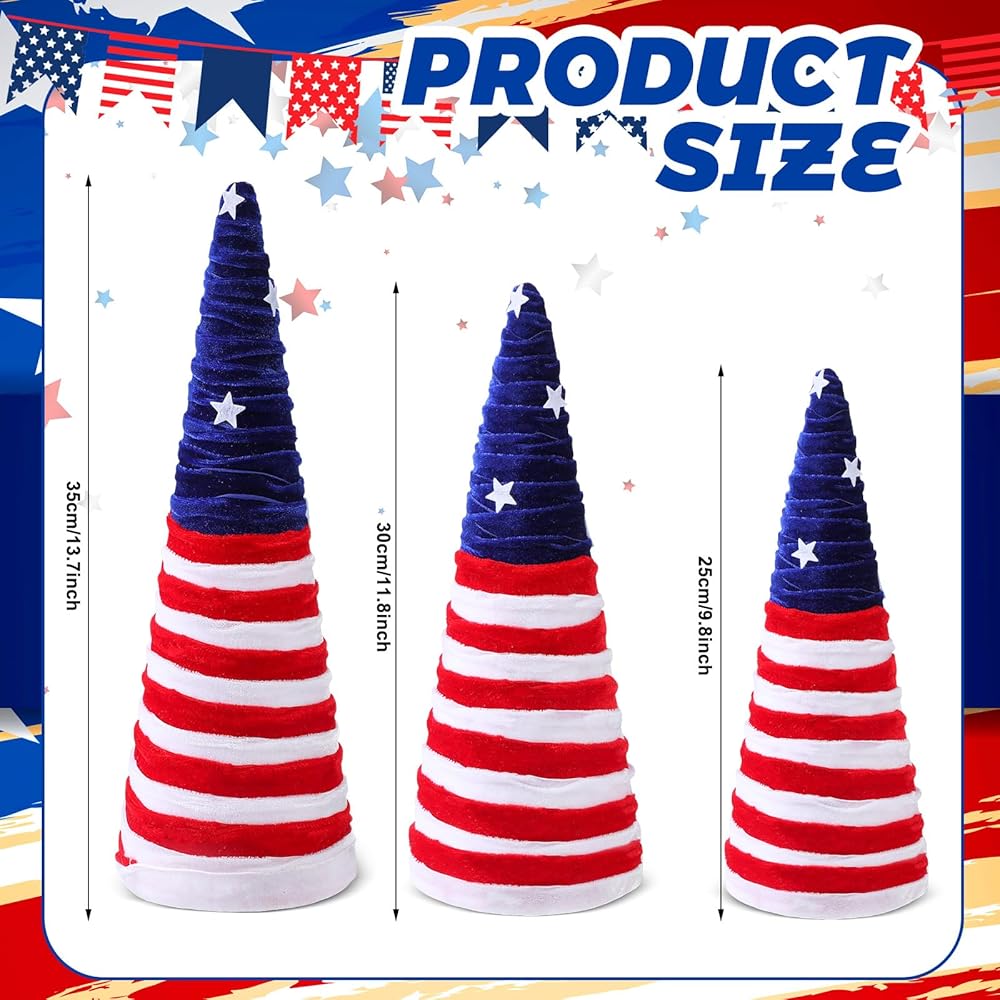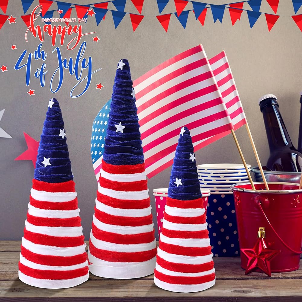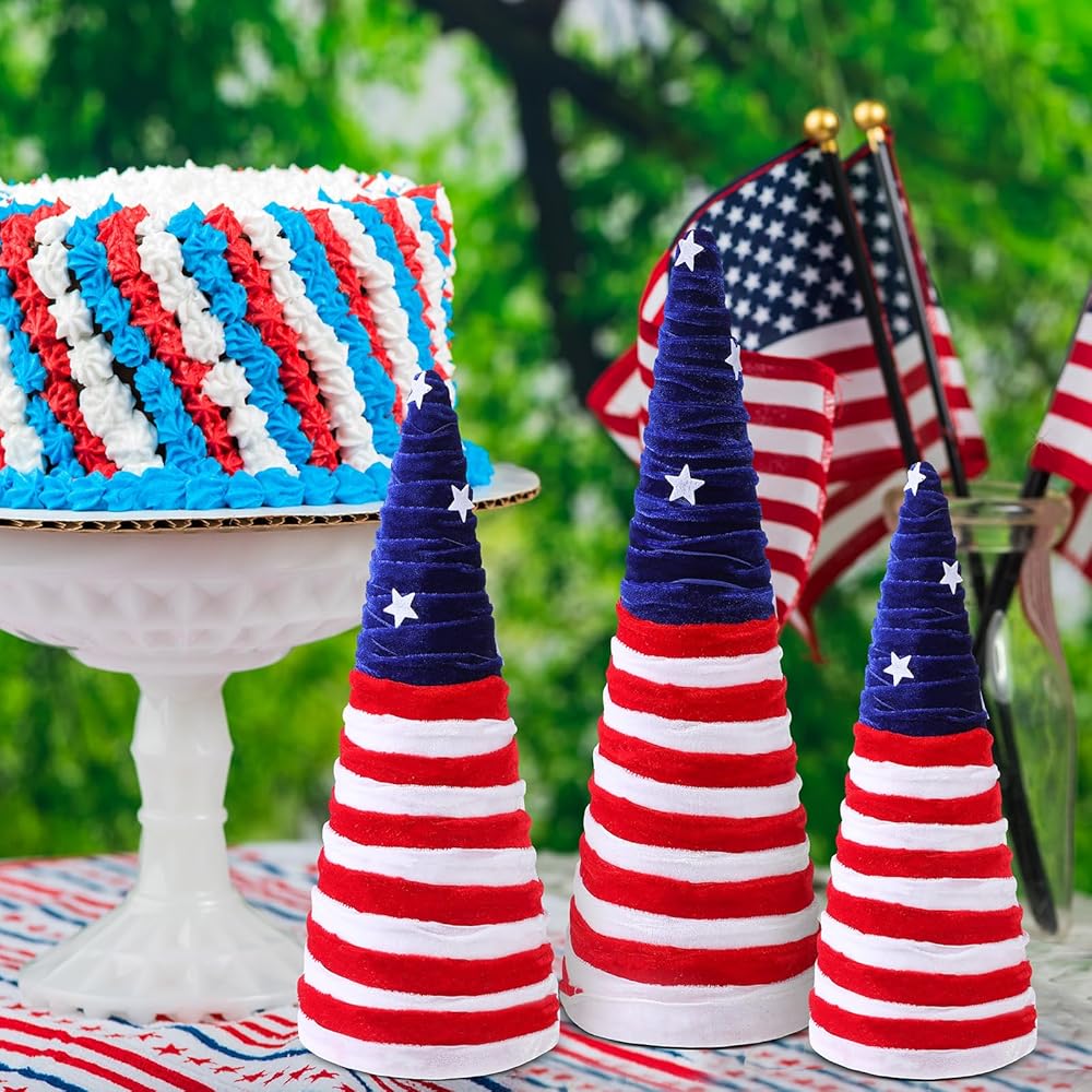 3 قطع من ديكورات الطاولة الوطنية في الرابع من يوليو، أشجار مخروطية أحمر أبيض وأزرق مخملي، شجرة مخروطية العلم الأمريكي، زخرفة الطاولة للذكرى، يوم الاستقلال التذكاري، قطع مركزية للطاولة، هدايا صينية متدرجة