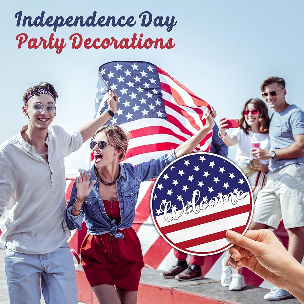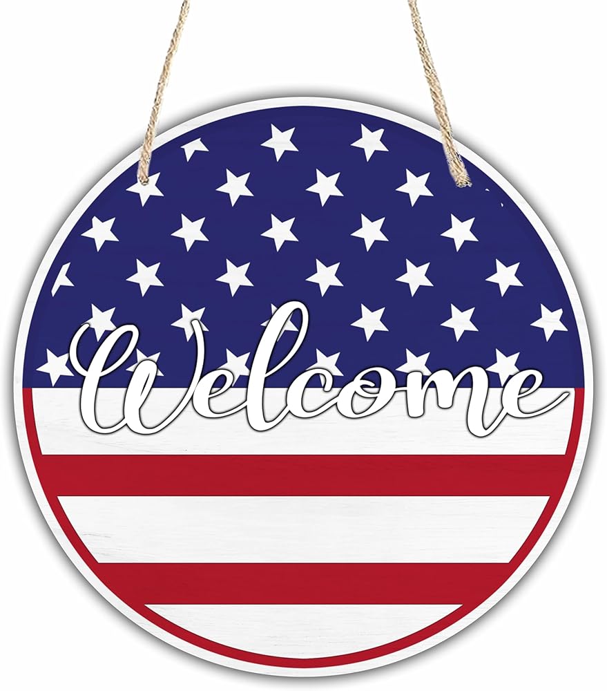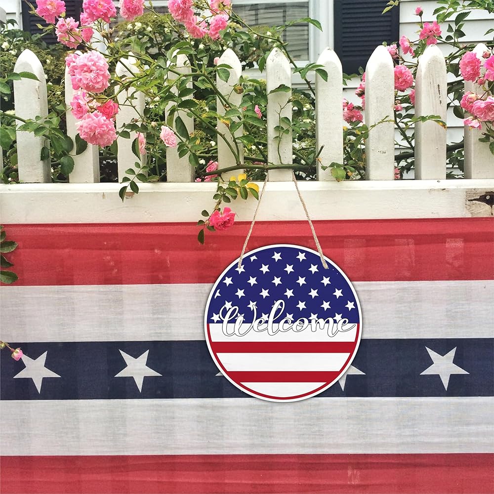 SIZE: The diameter of this round wooden hanging door sign is 10 inches, fit the most front door. PACKAGE INCLUDED: You will receive 1 round patriotic wooden sign & 1 sisal rope, convenience to decorate your space. METERIAL: Our July 4th hanging door signs are made of high quality middle density fiberboard, sturdy & durable, with sisal ropes in the package. APPLICATIONS: This is a nice home decor when the 4th of July is coming, nice patriotic decorations for home & office, you can use as a front door hanging sign or for the wall, porch and any place you like.