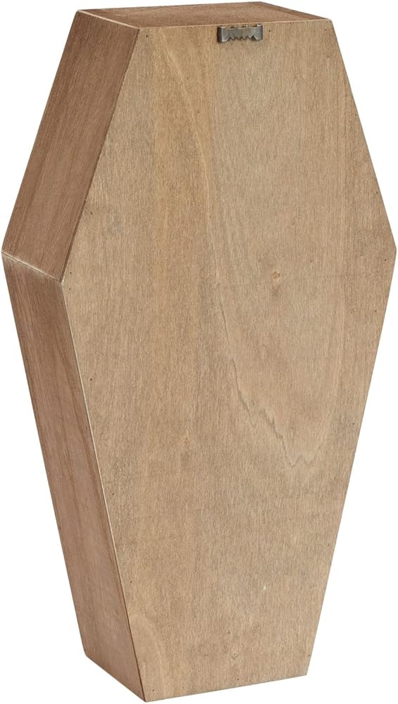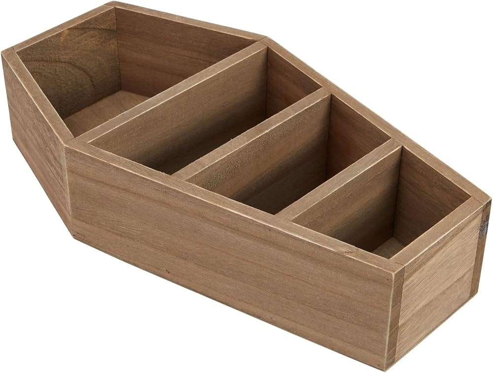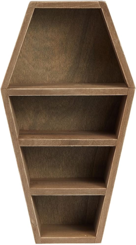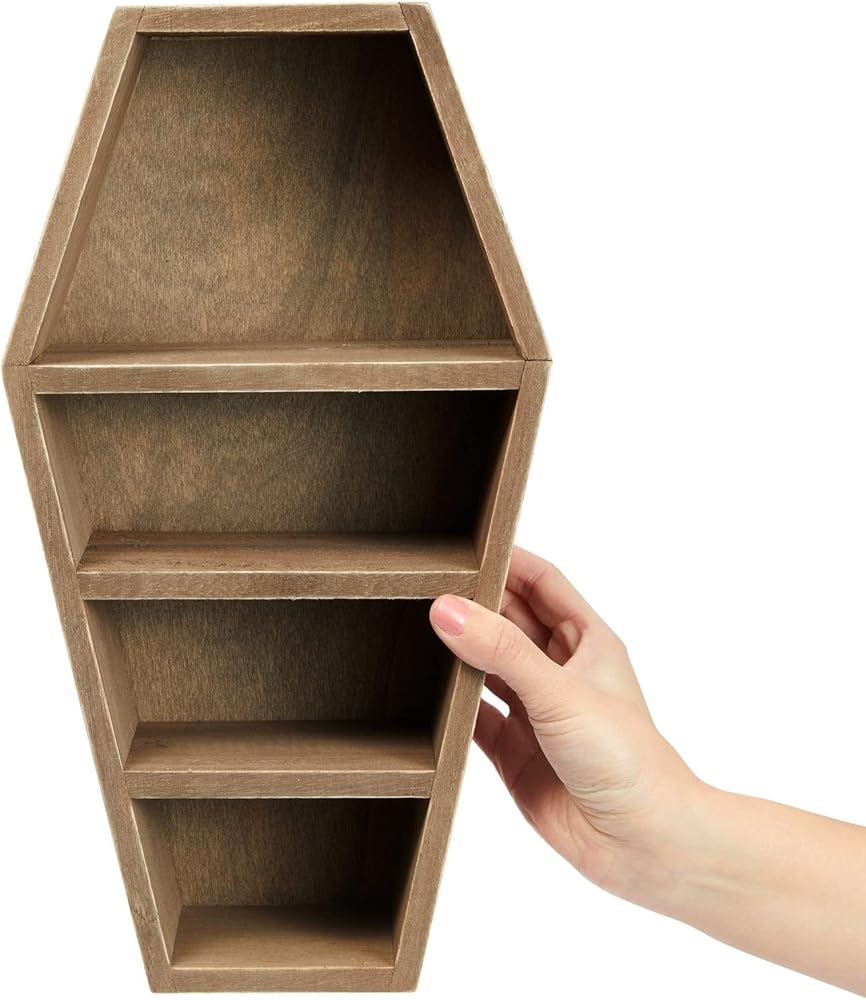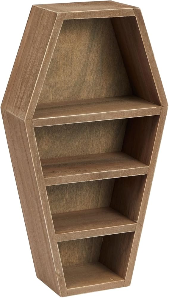 This coffin-shaped shelf is a unique and versatile storage solution that adds a creepy touch to any room in your household. It has four slots that can be used to store small trinkets, toys, and decorative items. It is perfect for anyone who loves spooky decor and wants to create a Halloween-themed environment in their home. To add a mysterious and spooky touch, you can place the coffin shelf in various spaces like your bedroom, living room, office desk, bathroom, or entryway. The stand is excellent for storage and lets you showcase your small decorative items, such as succulents, flowers, vases, and figurines. The convenient size of the mini coffin shelf, measuring 8x3x14 inches, is inobtrusive when placed on a bookshelf, countertop, desktop, or in your vanity room. The coffin shelf is made of paulownia wood, giving it a rustic-style look. The paulownia wood construction ensures sturdiness. It is an excellent option for anyone looking to add a creepy touch to their home while also having a practical storage solution. Whether using it to store small trinkets or showcase your DIY creations, the coffin decor shelf will surely become a conversation starter in any room.