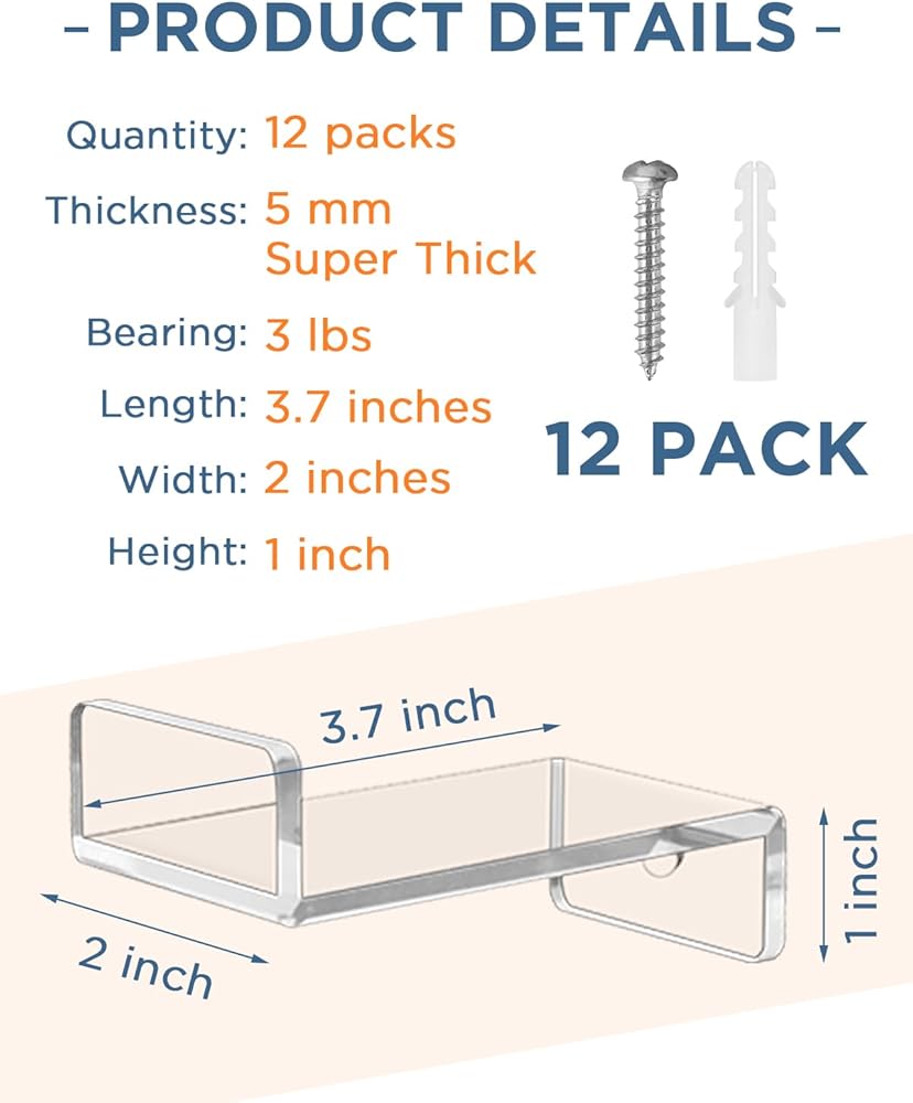 قيمة مقابل المال - تأتي العبوة مع 12 قطعة من الحامل. مصنوع من الأكريليك عالي الجودة بسمك 5 مم. سميكة للغاية ومتينة. الأكريليك شفاف للغاية وغير مرئي، مما يخلق تأثيرًا عائمًا.