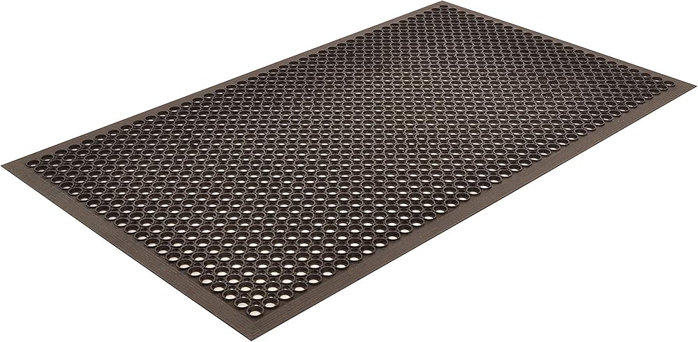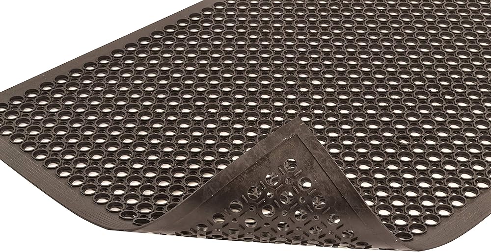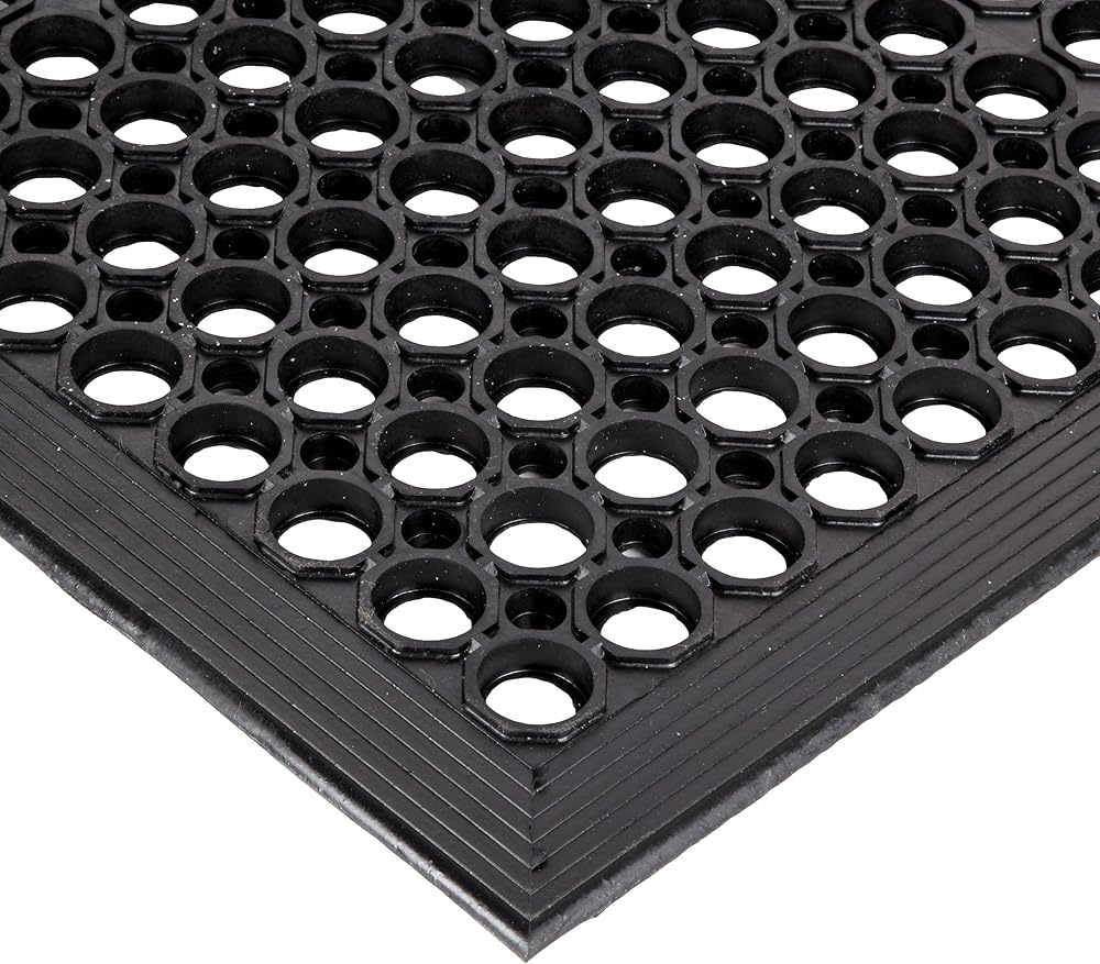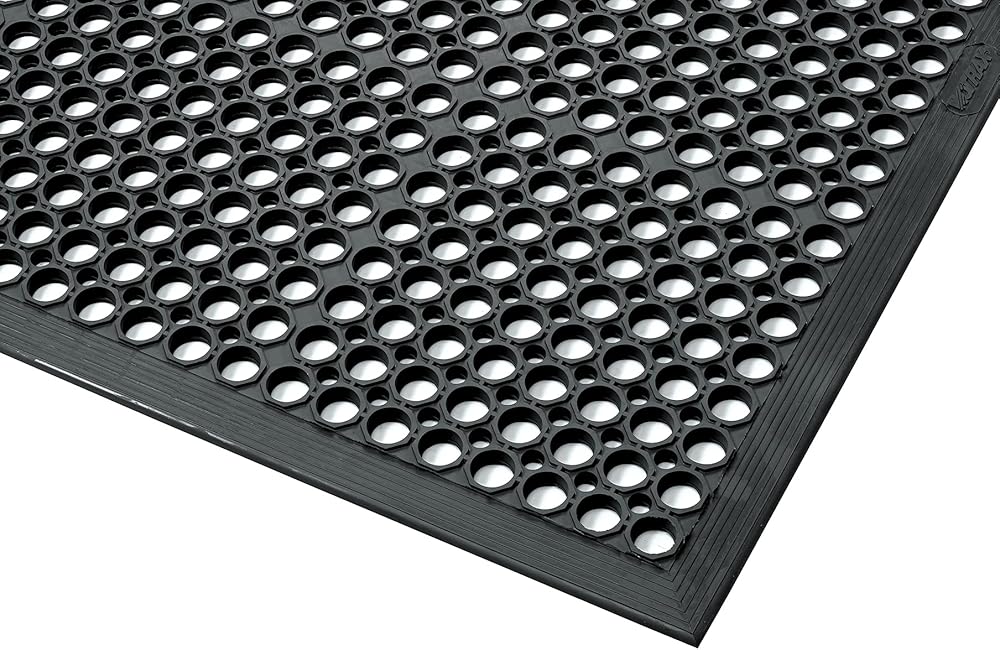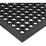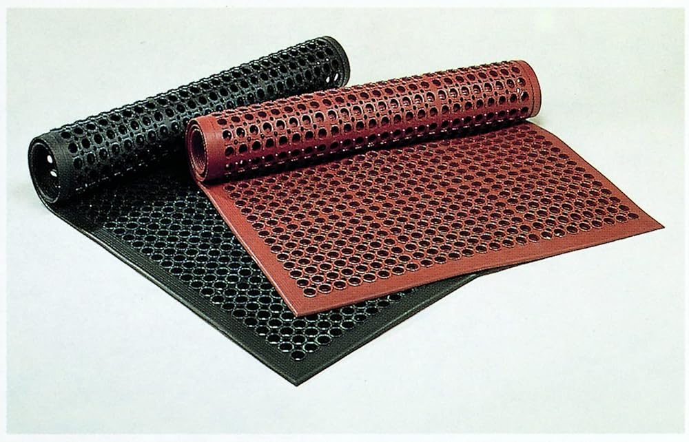 Sanitop large hole design with built-in ramps offers easy handling as well as safety/anti-fatigue benefits in grease resistant black or grease proof red rubber mat.