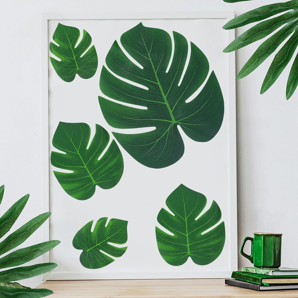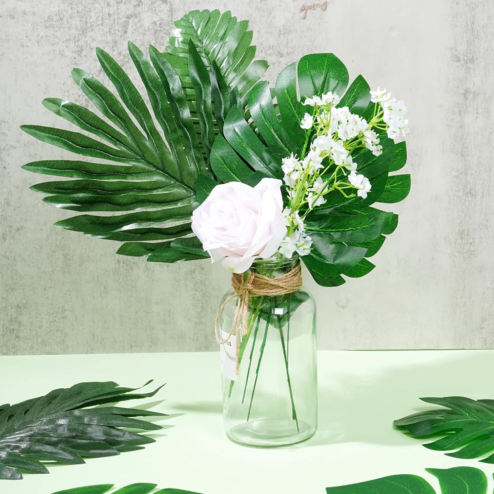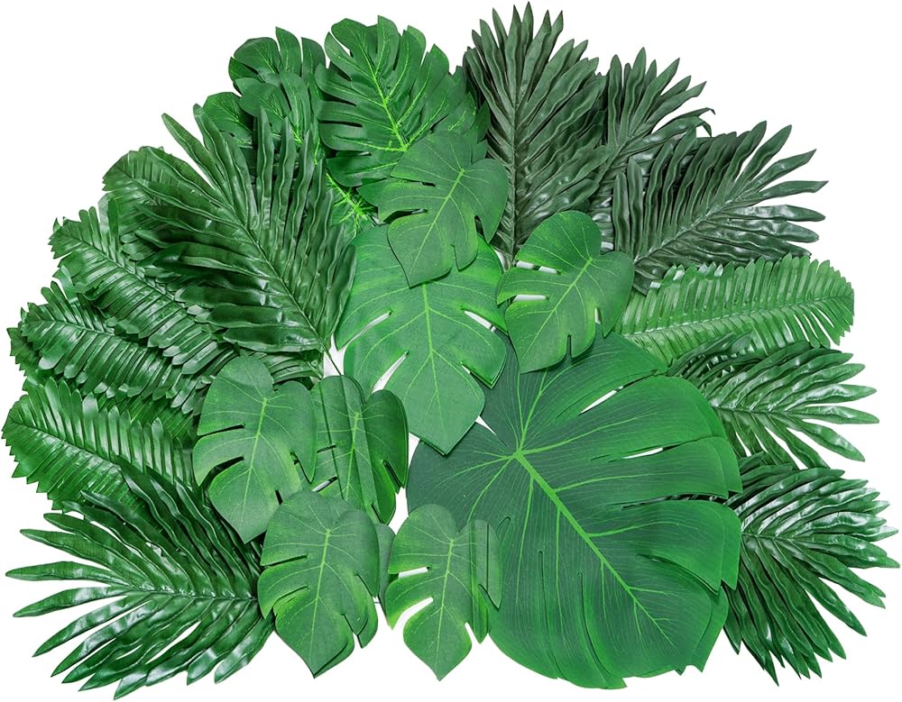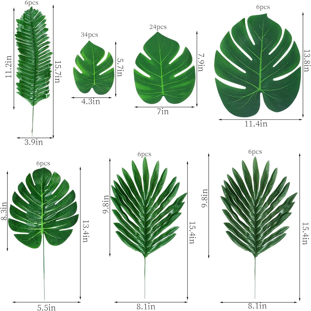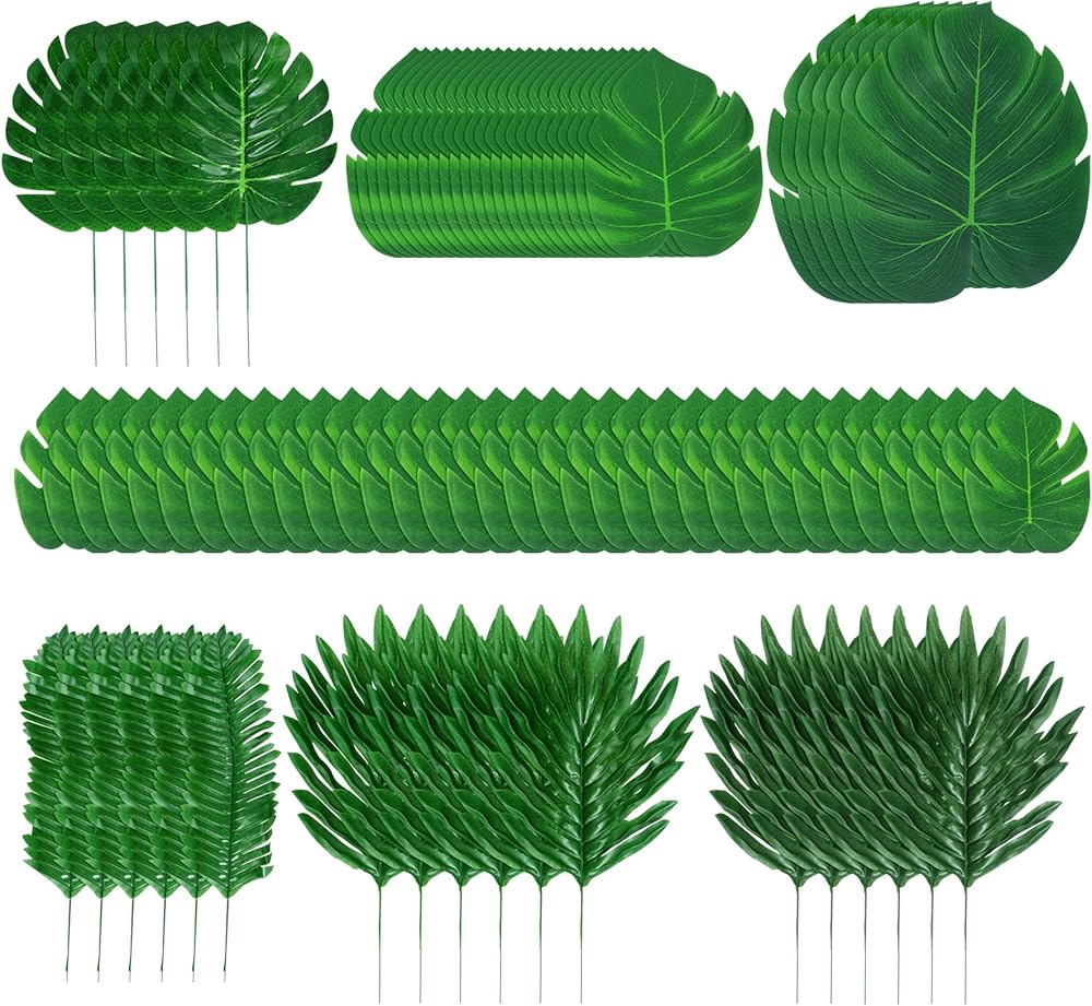 Package Include: Package comes with 88pcs artificial leaves, including 3 different size monstera palm leaves and 4 different style tropical leaves with stems, 34pcs small size, 24pcs medium size and 6pcs large size monstera palm leaves, 30pcs 4 style artificial tropical leaves with stems, 6 pieces per style. sufficient quantity and different style can satisfy you daily or festive use and replacement needs.