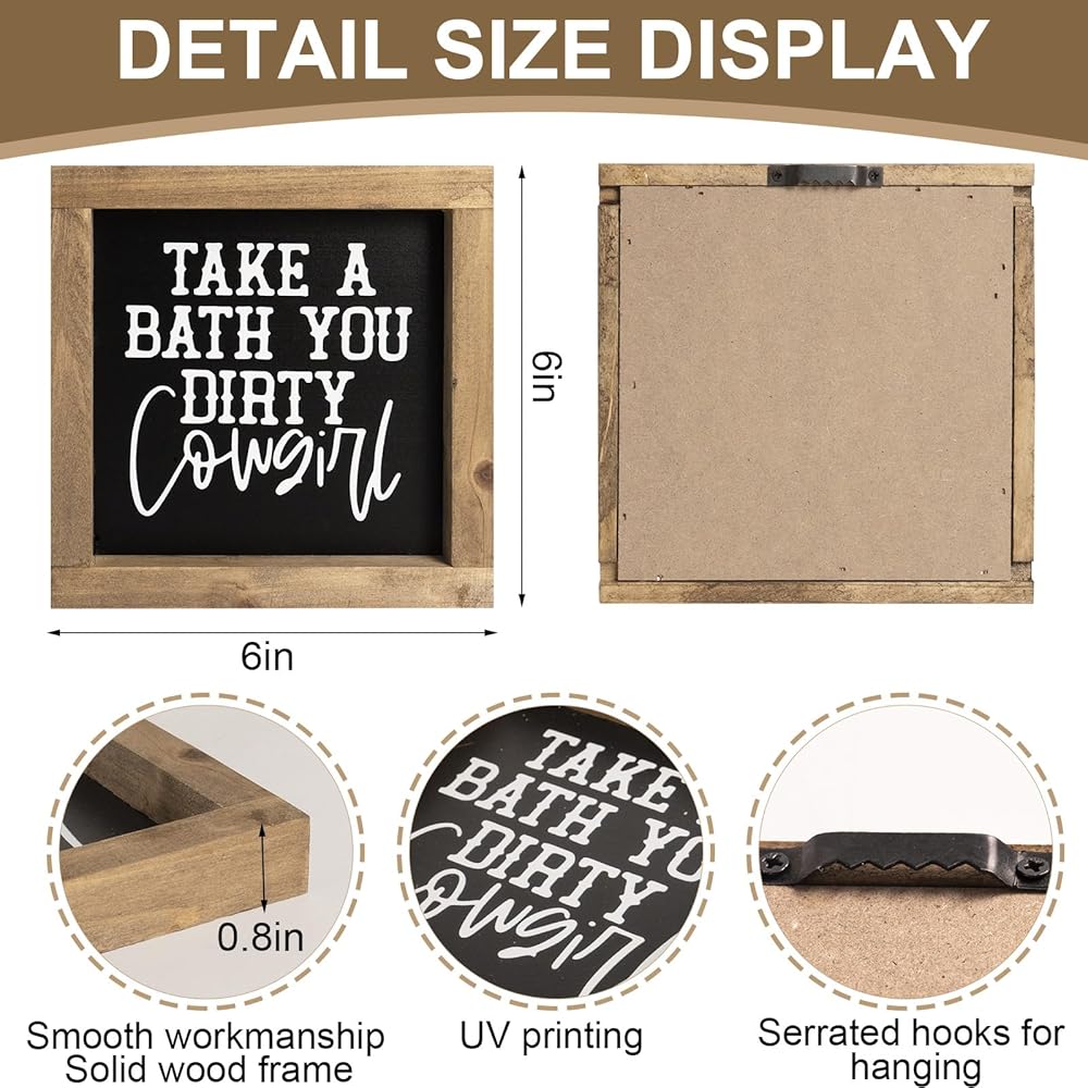 this stylish wooden sign measures 6 inches in both length and width, with a thickness of 0.8 inches.As a stylish and playful addition and creating a captivating atmosphere in your washroom space.
