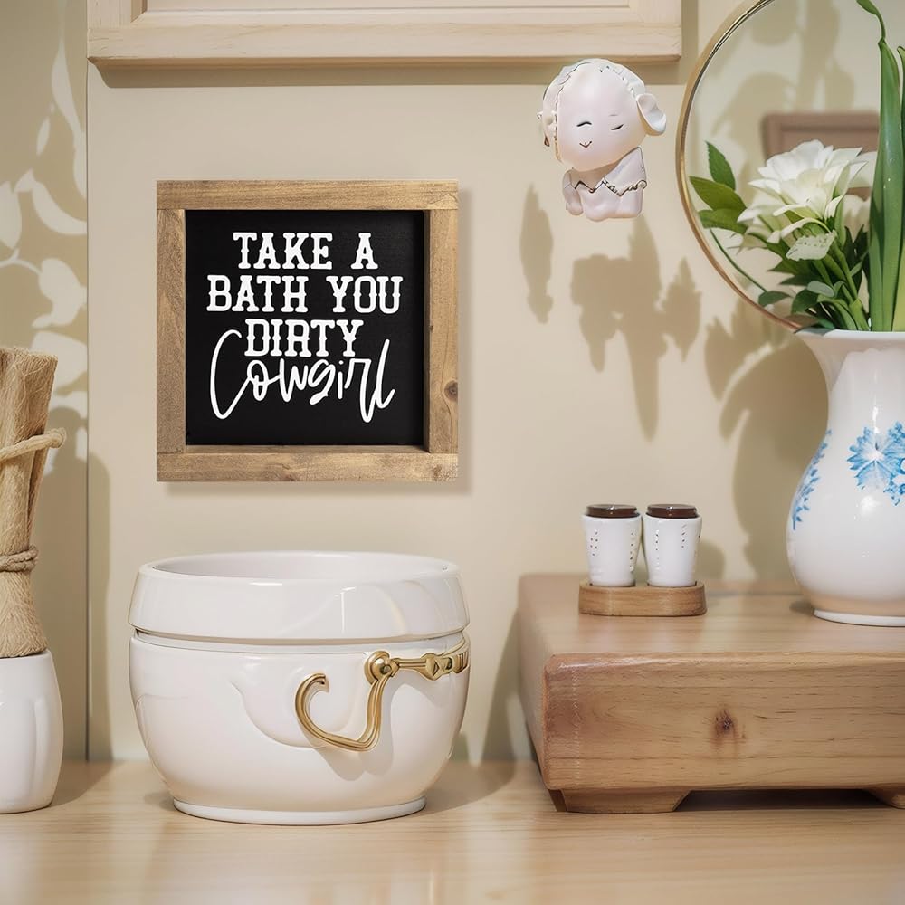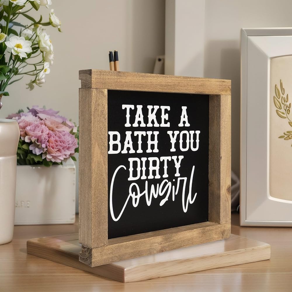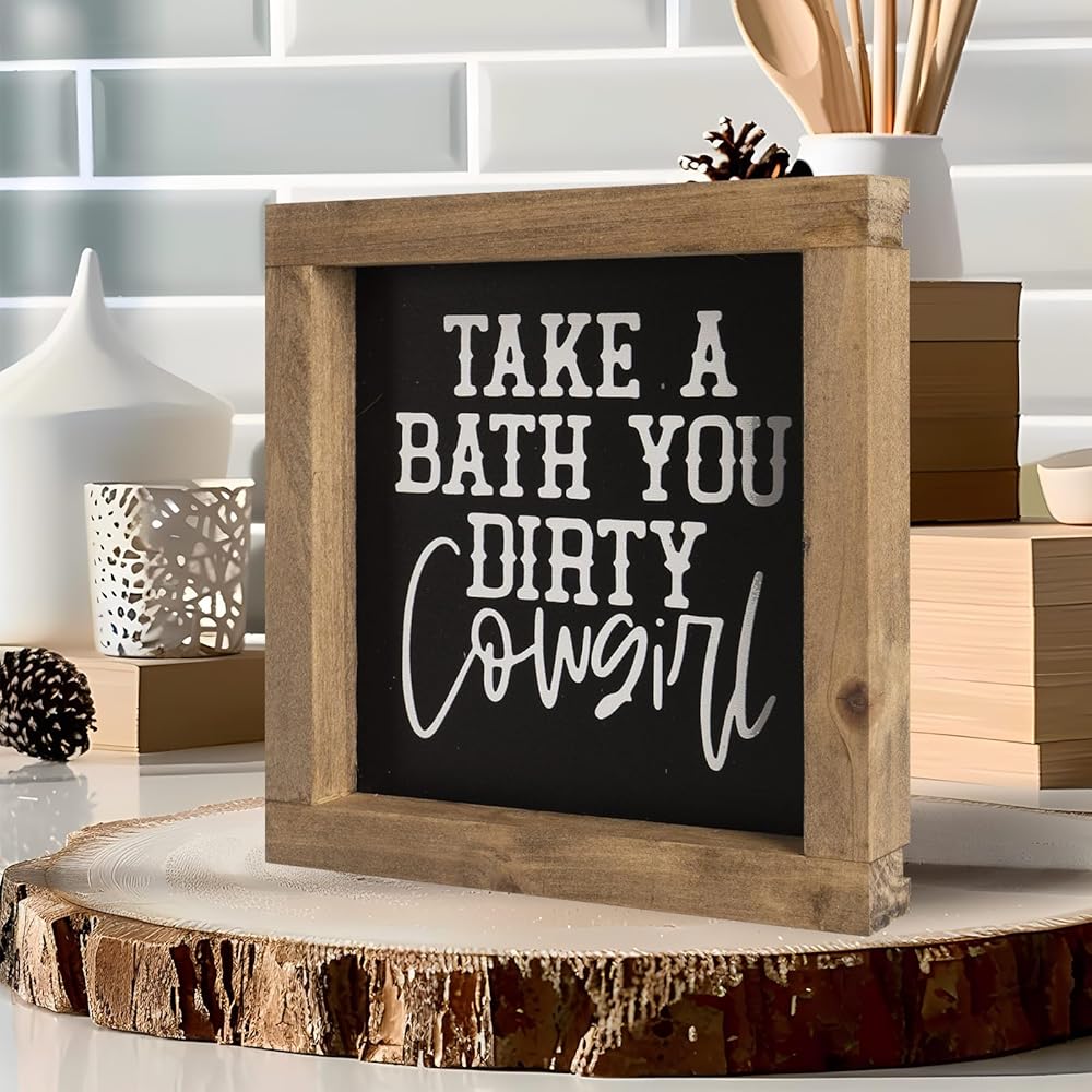 Western Cowboy Bathroom wooden sign features a black background boldly displaying the phrase "Take A Bath You Dirty Cowboy" in white lettering, encouraging cleanliness and self-care. You can easily hang it on a wall to your bathroom or place it on a tabletop or shelf. Infuse your bathroom with the charm of the Wild West and let this wooden sign be a conversation starter.