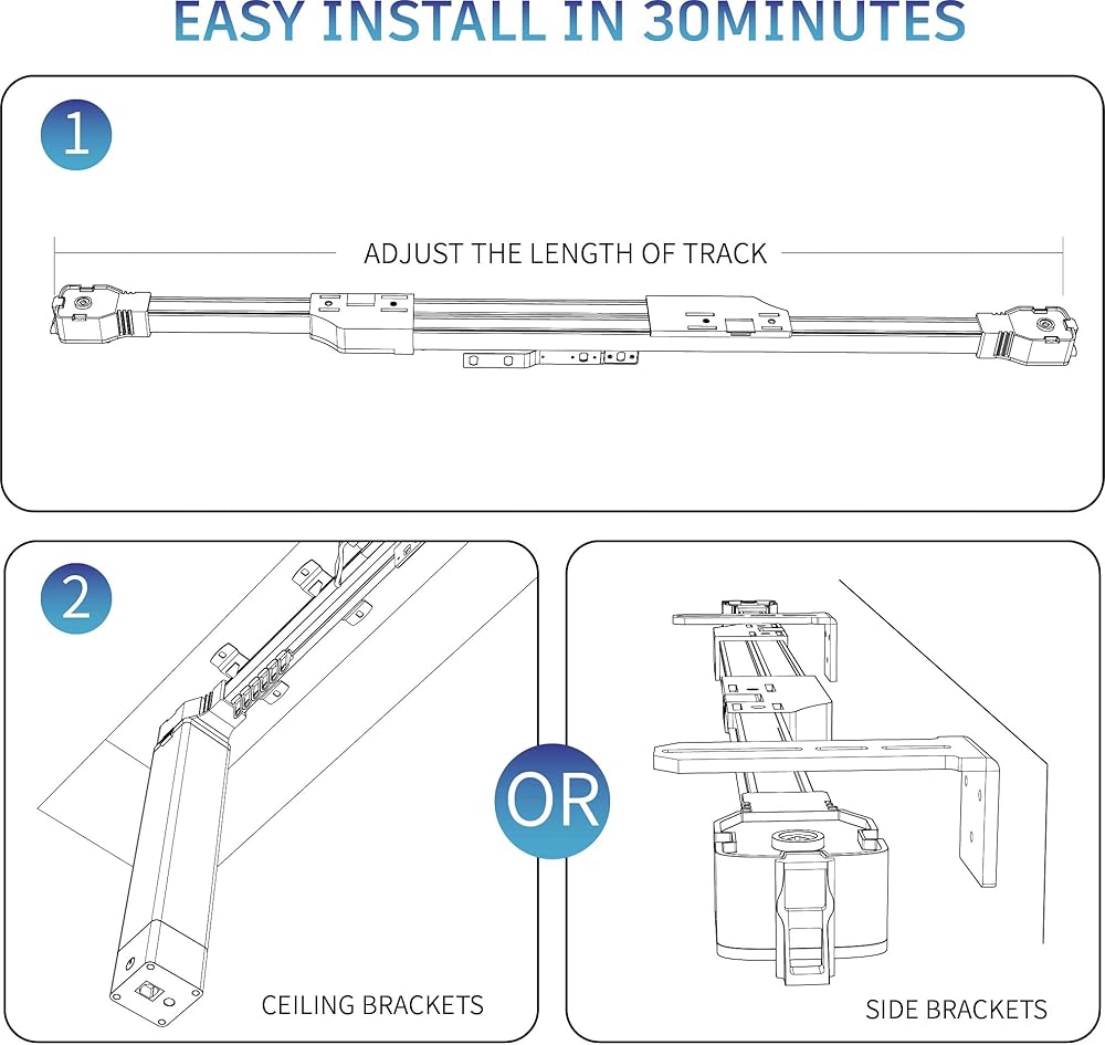 سهل التركيب: لا حاجة لربط أجزاء المسار معًا، فقط قم بضبط الحجم الذي تحتاج إلى تثبيته. بعد ضبط الحجم، يمكنك اختيار التثبيت بالسقف أو التثبيت على الحائط الجانبي.
