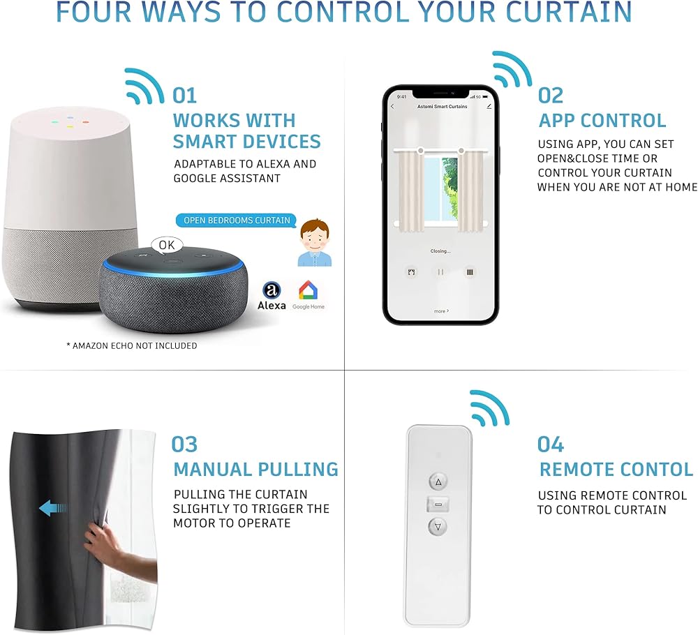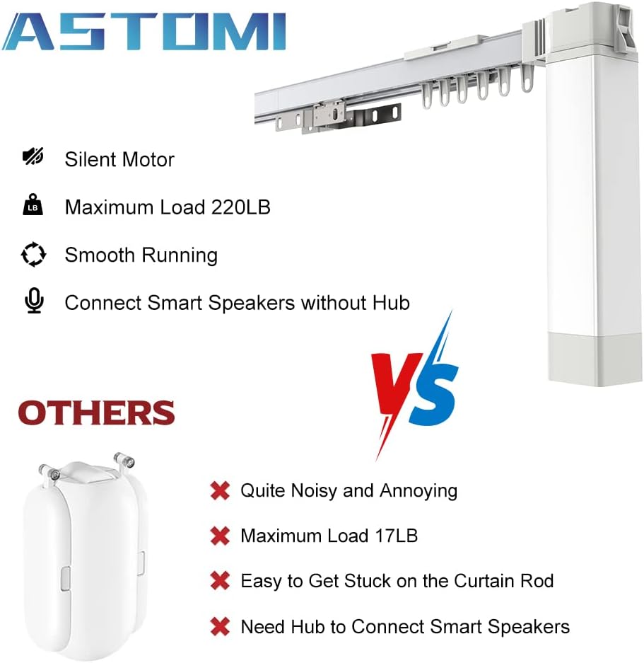 تصميم إنساني: مسارات الستائر الكهربائية Astomi مثالية للستائر الثقيلة أو التي يصعب الوصول إليها. نظام ستائر يمكن التحكم فيه عن بعد. تخيل أنك تستيقظ بطريقة طبيعية من خلال تحديد موعد لفتح الستائر. وبدلاً من ذلك، تؤدي المزامنة مع أوقات غروب الشمس وشروقها المحلية إلى إنشاء نظام ستائر آلي حقًا.
