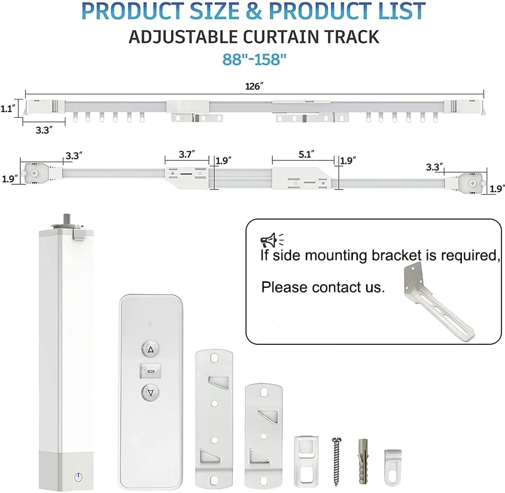 مسار قابل للتمديد: مصمم بفكرة الطول القابل للتعديل، من 88 بوصة إلى 158 بوصة، مسار الستارة المزود بمحرك هذا مناسب لأحجام النوافذ المختلفة، مما يوفر لك مشكلة التخصيص الخاص.