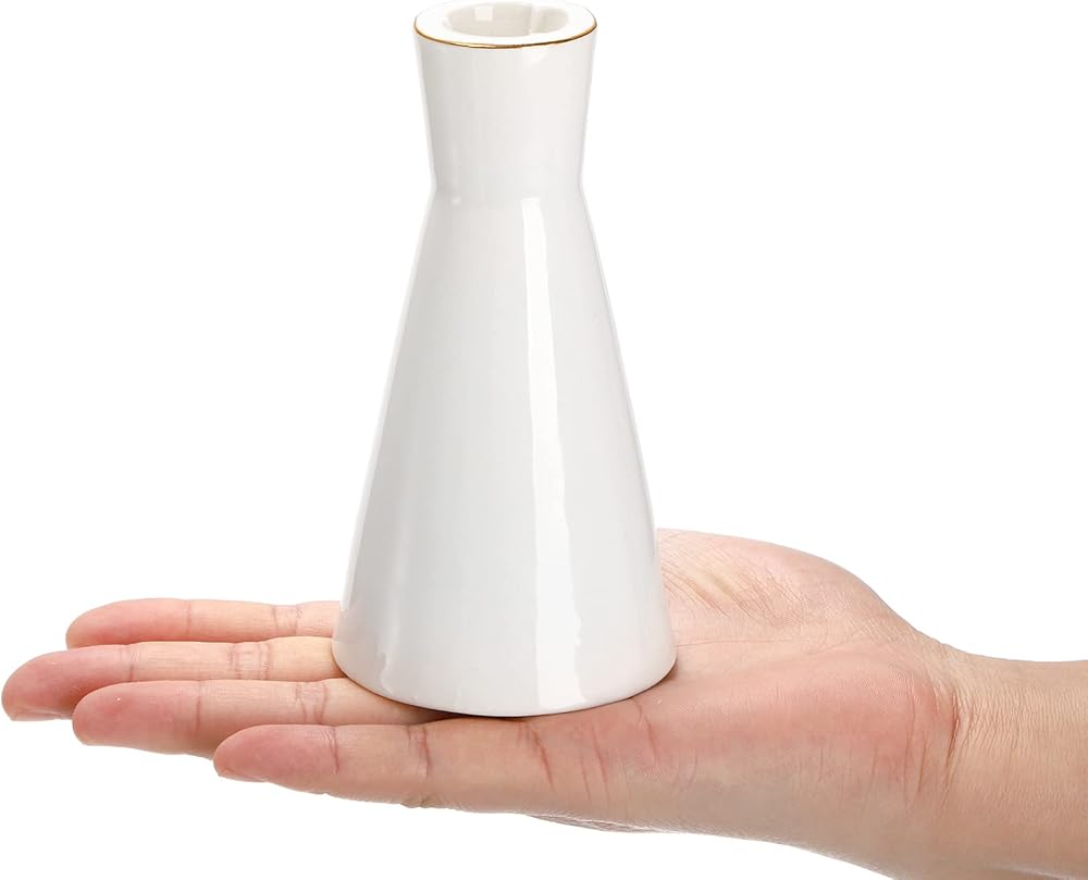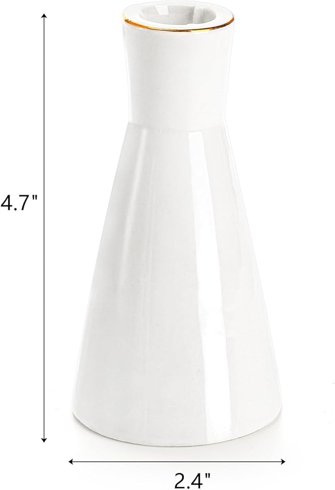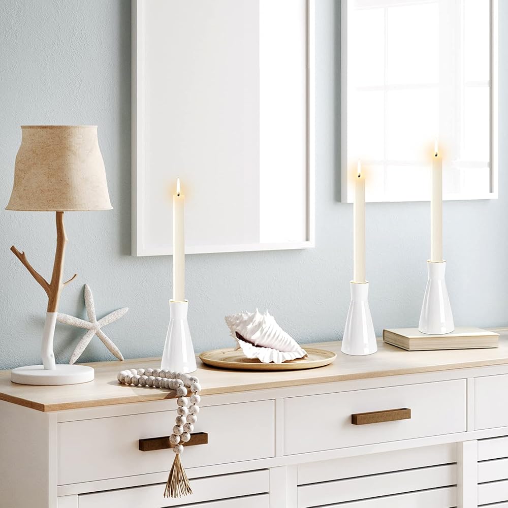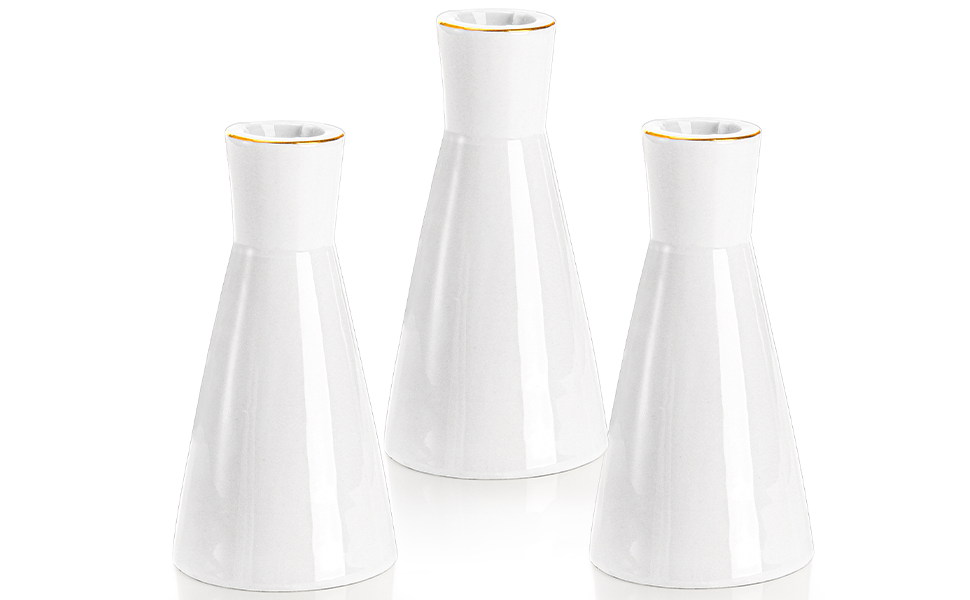 تصميم أنيق: حاملات الشموع المستدقة الخاصة بنا باللون الأبيض الكلاسيكي، وتتميز بشكل الساعة الرملية الأنيق، ومزينة بحافة ذهبية، ومظهر بسيط ونمط عصري.