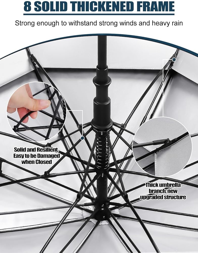 【Qquality Materials】The double layer windproof umbrella made of 210T water repellent pongee fabric,durable with 8 ribs and high-quality steel shaft make the umbrella more sturdy, enhance its windproof effect.