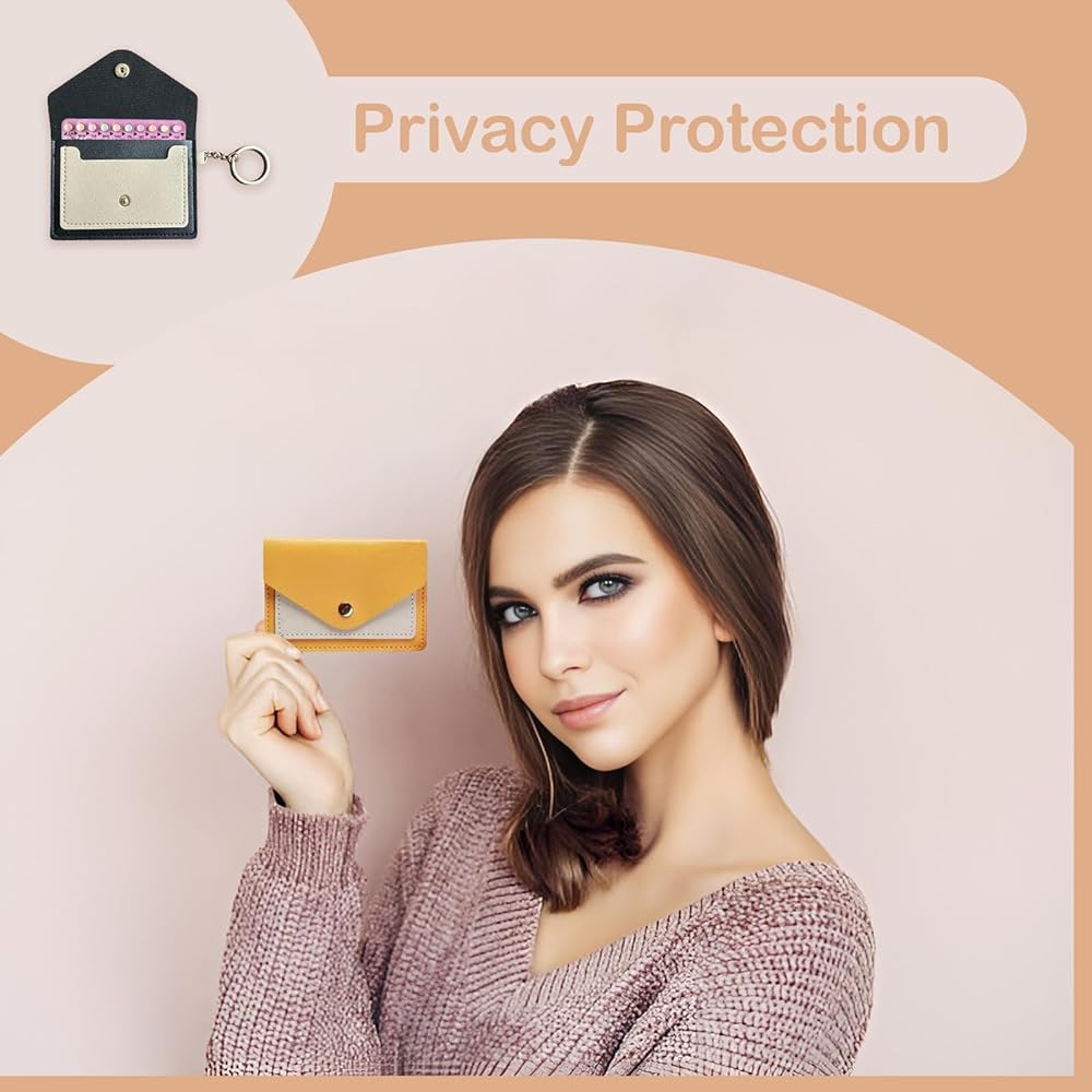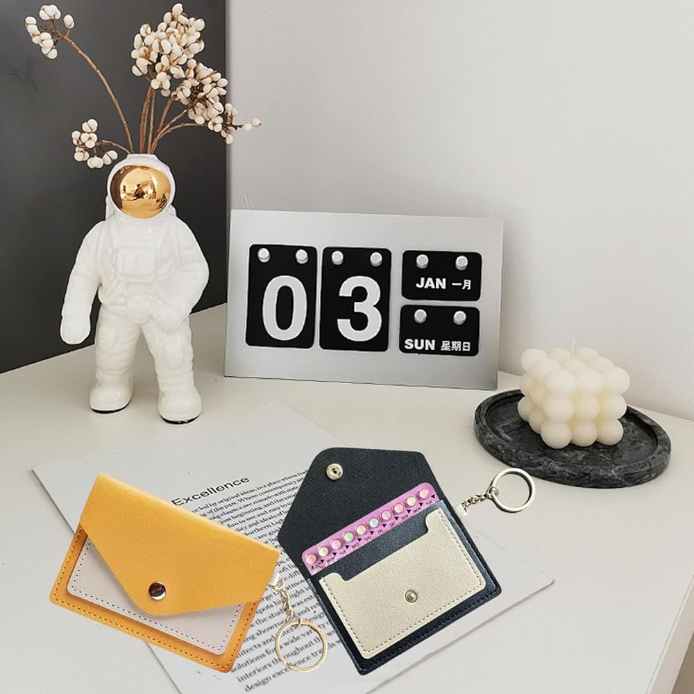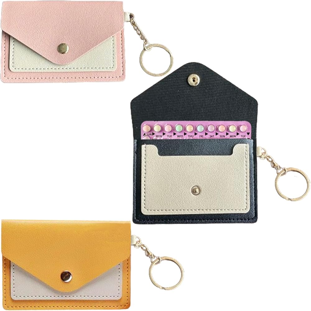 Pcmursal 3 Pack Birth Control Pill Case Holder Cute 4.3 x 3 Inch Small Pill Holder for Purse PU Leather Wallet Birth Control Pill Sleeve Packet with Key Ring (Pink, Black, Yellow)