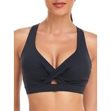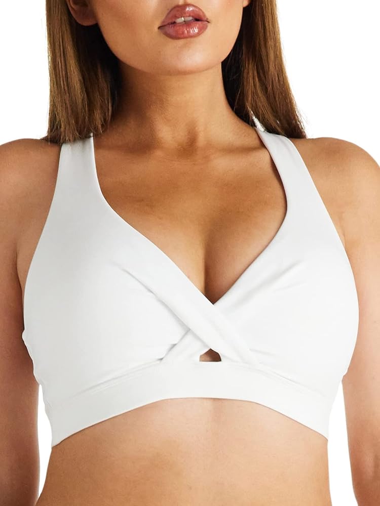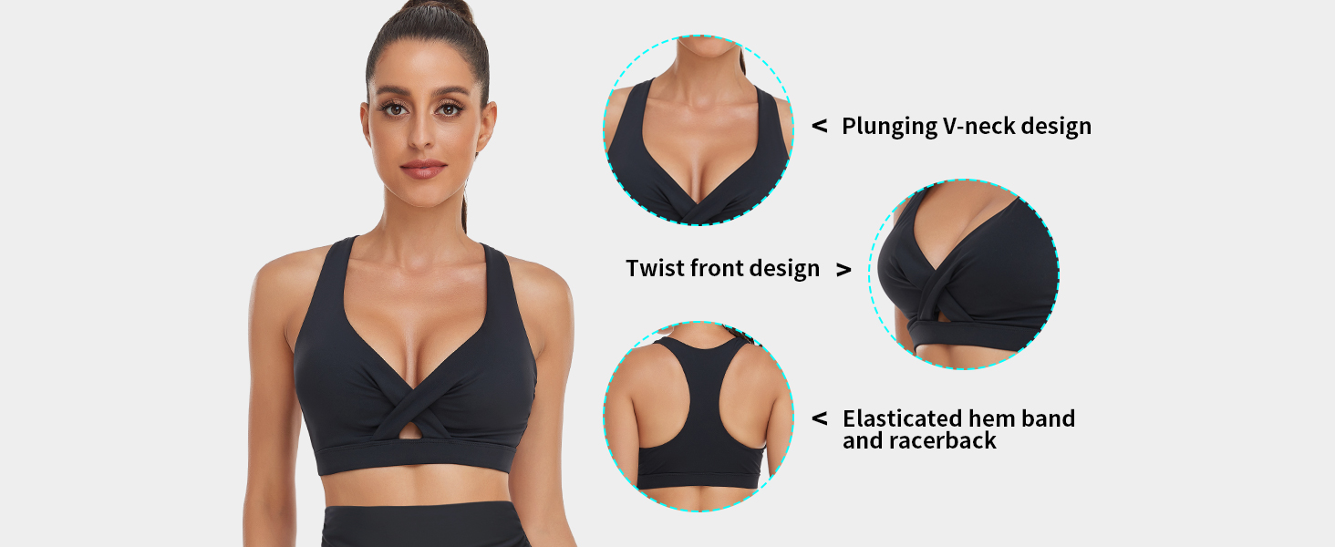 • جبهة ملتوية، تصميم رقبة على شكل حرف V، شريط حاشية مطاطي، حمالة صدر رياضية بظهر متسابق