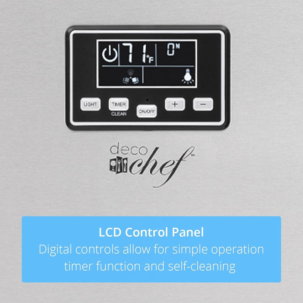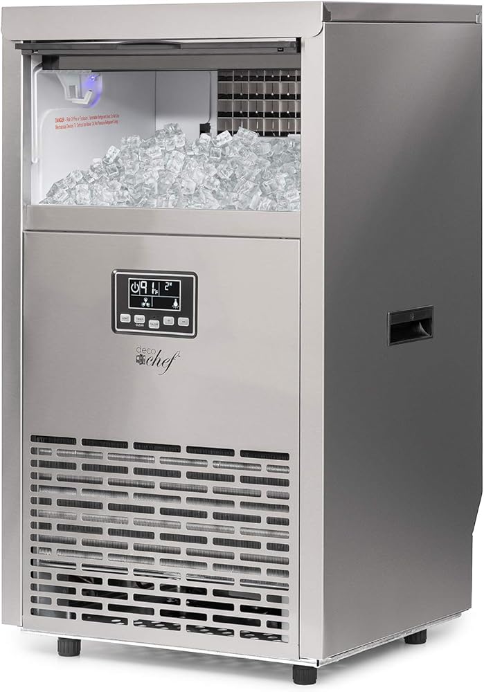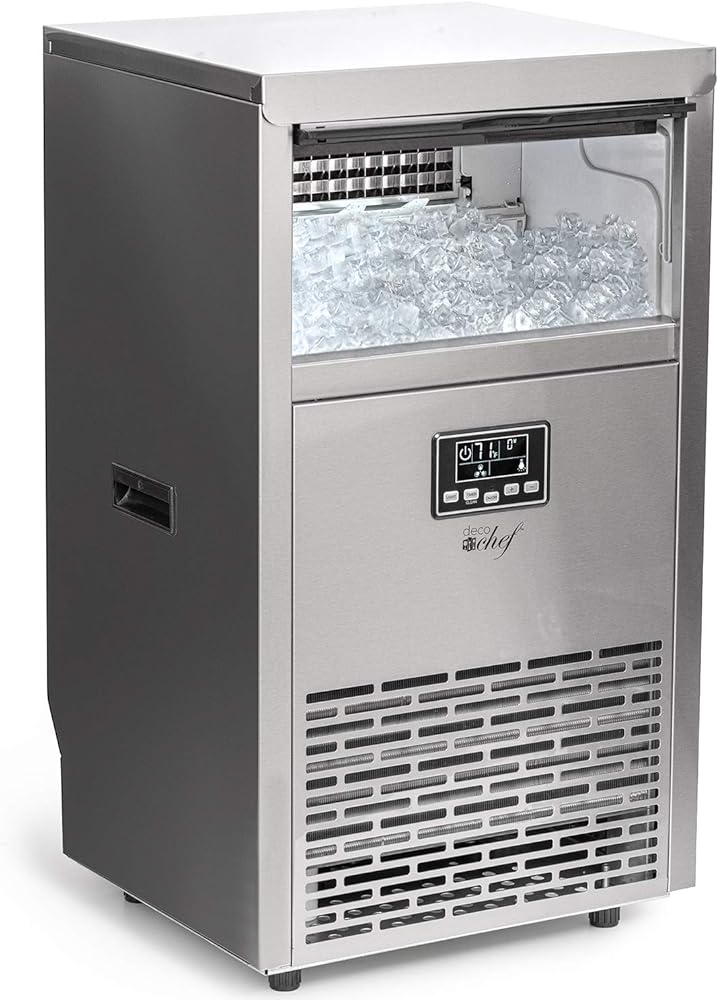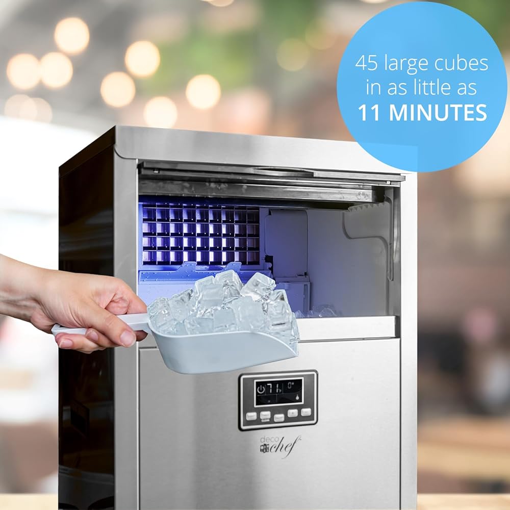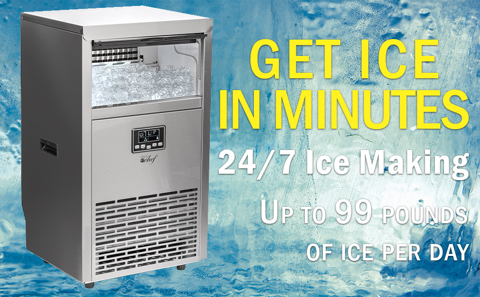 • ماكينة ثلج عالية السعة - تصنع ما يصل إلى 99 رطلاً من الثلج يوميًا. بالإضافة إلى صنع الثلج السريع، يقوم صانع الثلج التجاري هذا بتخزين ما يصل إلى 33 رطلاً من الثلج مما يبقيه باردًا وجاهزًا للتقديم. تتيح لك شاشة LCD معرفة درجات الحرارة الخارجية والداخلية وحالة الجهاز الحالية. تتيح لك واجهة الزر البسيطة التحكم في وظيفة المؤقت وإضاءة الخليج.