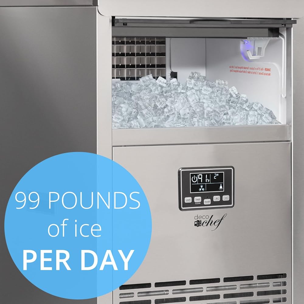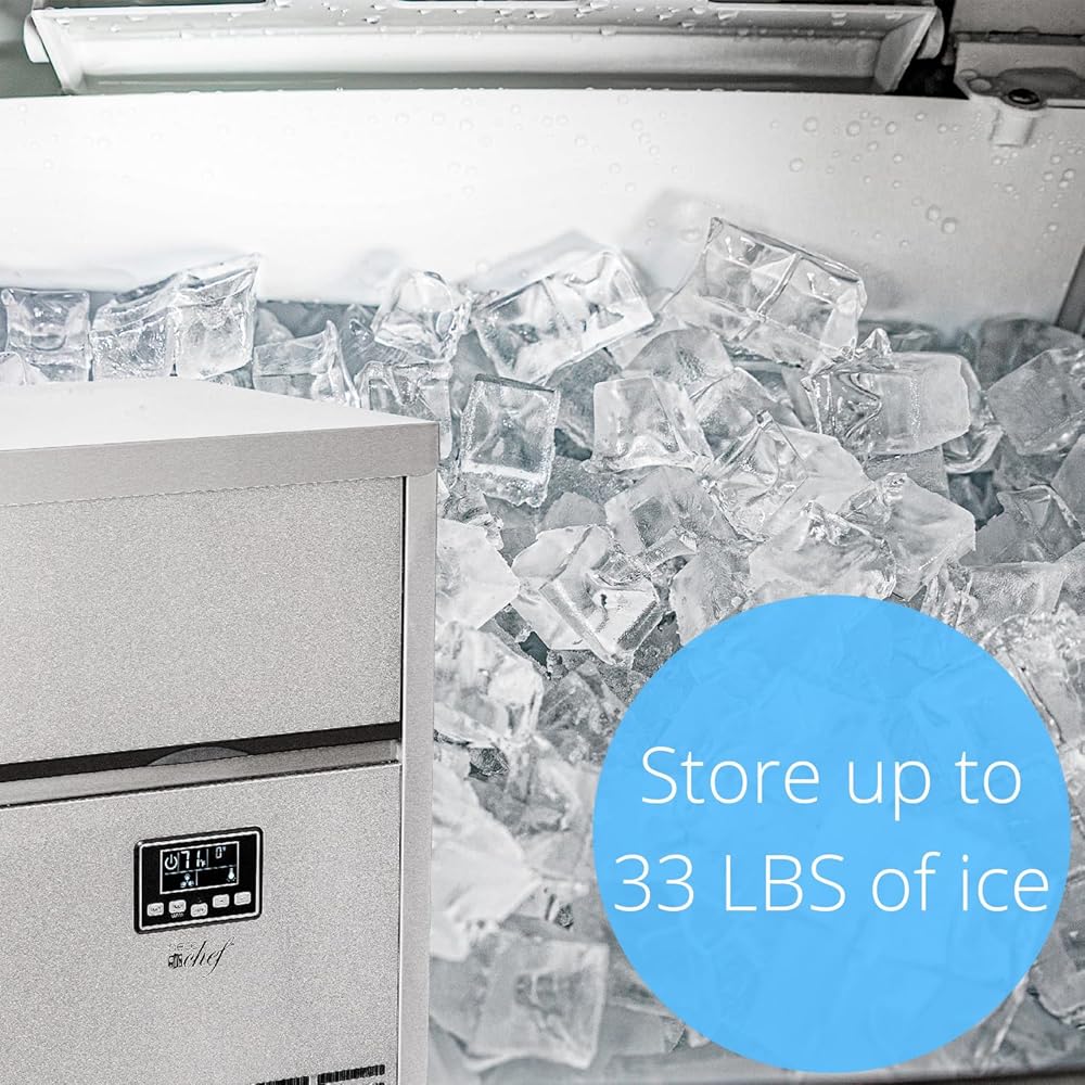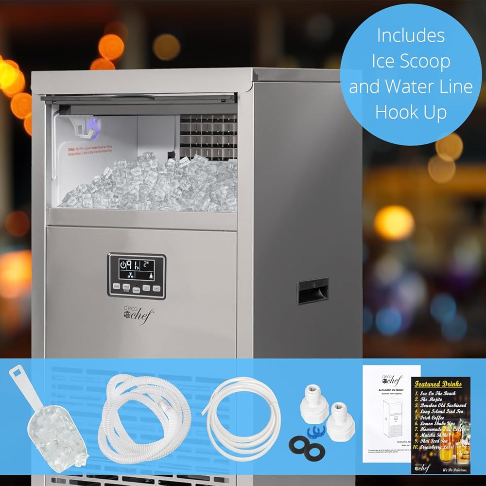 صانعة الثلج التجارية من ديكو شيف 99 رطل كل 24 ساعة سعة تخزين 33 رطل من الفولاذ المقاوم للصدأ رائعة للفنادق والمطاعم والحانات والمنازل والمكاتب تتضمن خراطيم التوصيل ومغرفة الثلج
