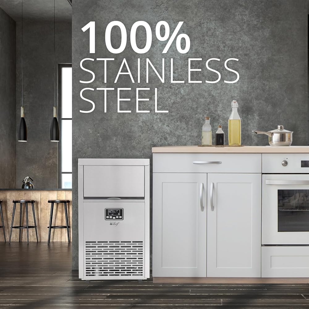 • صنع الثلج تلقائيًا على مدار الساعة طوال أيام الأسبوع - سواء كنت تدير مطعمًا يتطلب كميات كبيرة من الثلج أو لا يمكنك ببساطة الحصول على ما يكفي في المنزل، فإن ماكينة صنع الثلج المصنوعة من الفولاذ المقاوم للصدأ تضخ 45 مكعبًا كبيرًا من الثلج كل 11-20 دقيقة في صفائح كبيرة.