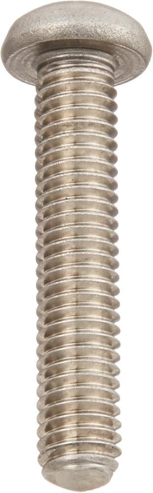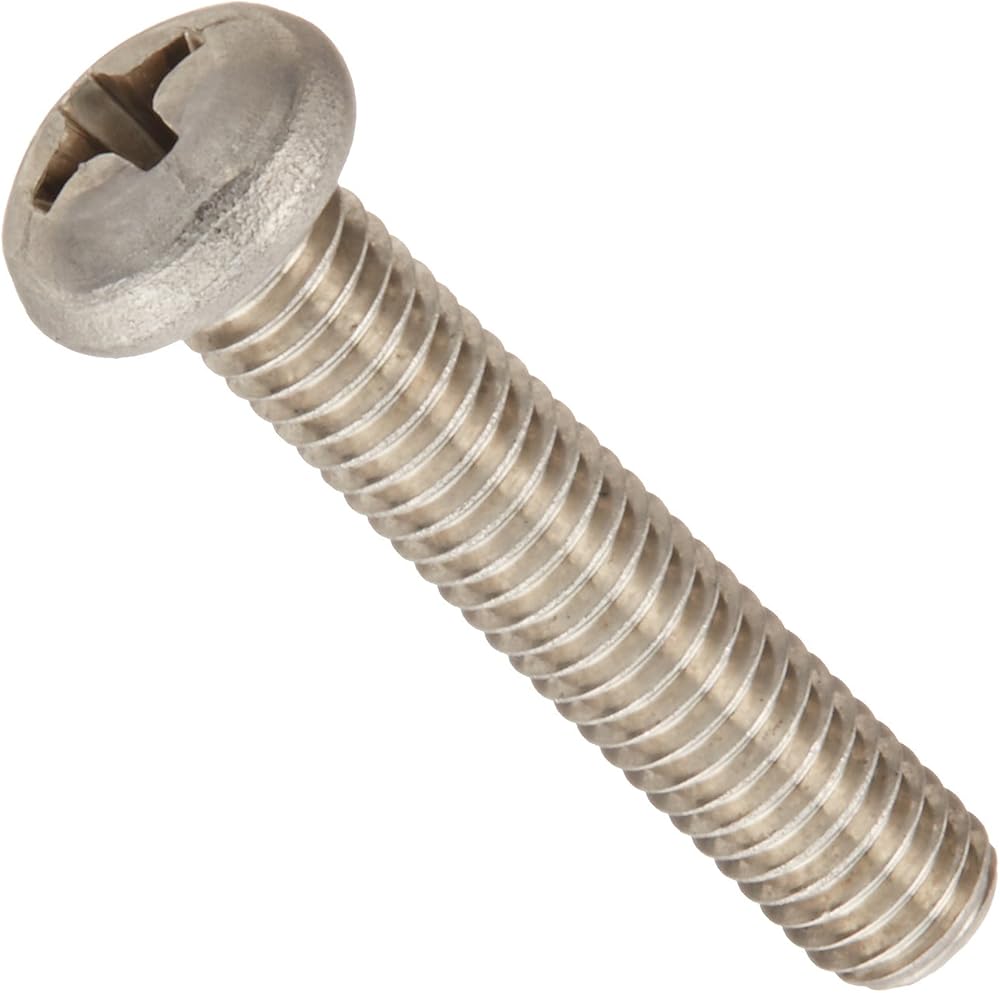 The 18-8 stainless steel machine screw has a plain finish and a round head with a Phillips drive, and meets American Society of Mechanical Engineers ASME B18.6.3 specifications. The 18-8 stainless steel material provides strength and offers good corrosion resistance in many environments. The material may be slightly magnetic. The Phillips drive has an x-shaped slot that accepts a Phillips driver and is designed to allow the driver to slip out of the head to help prevent over-tightening and damage to the thread or fastener. The round head has a domed shape.