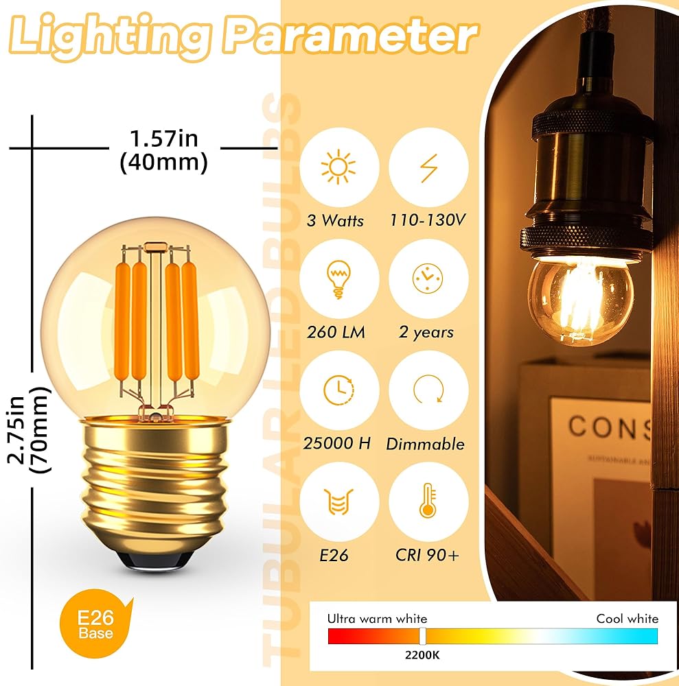 <معلمات المنتج> لمبة LED G40 E26: قاعدة لولبية قياسية E26، طاقة 3 واط، تعتيم 0-100%، 260 لومن، ضوء دافئ 2200 كلفن، زاوية الشعاع 360، جهد تيار متردد 110-130، CRI>90+. الارتفاع: 60 ملم (2.36 بوصة)، القطر: 40 ملم (1.57 بوصة)
