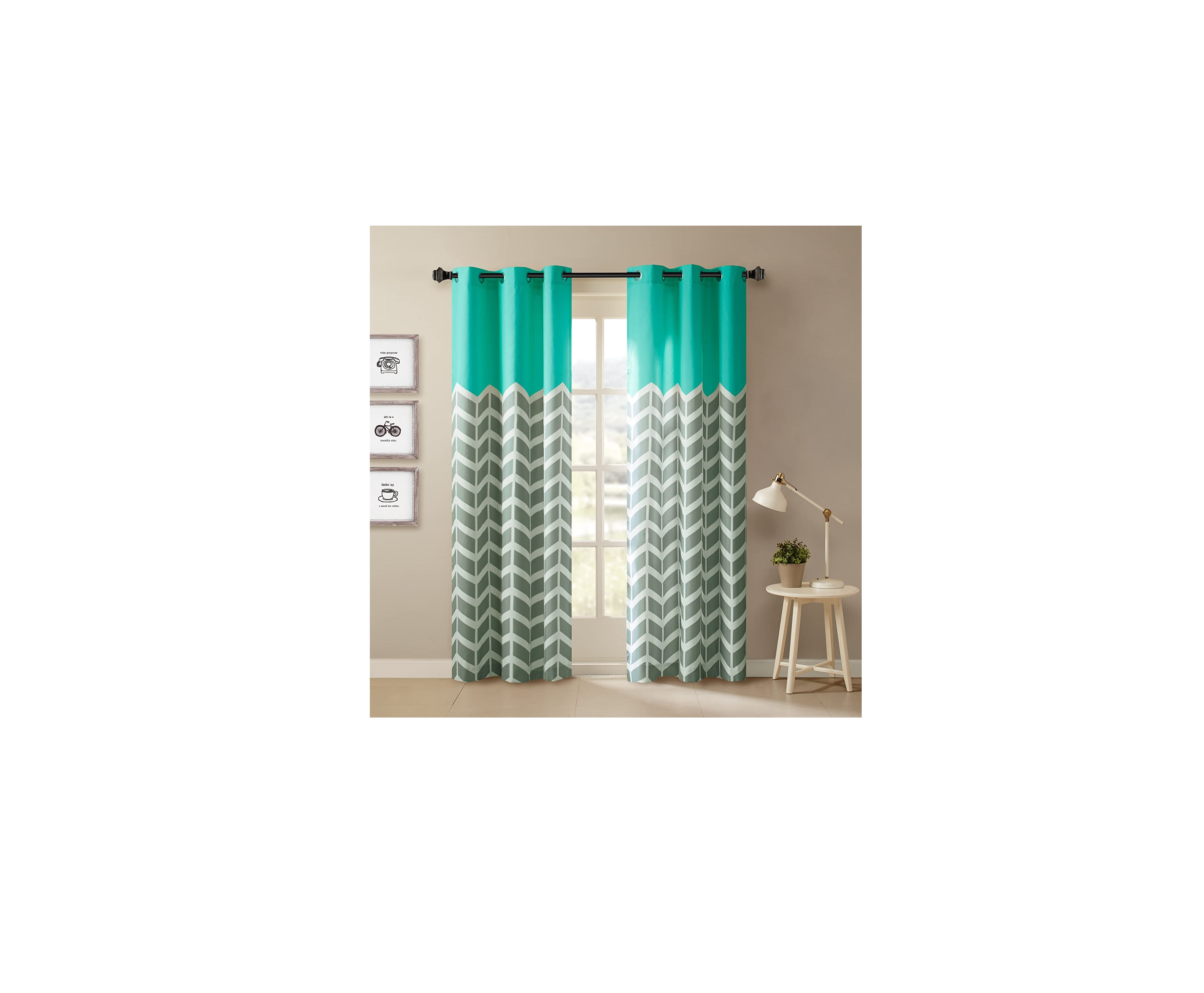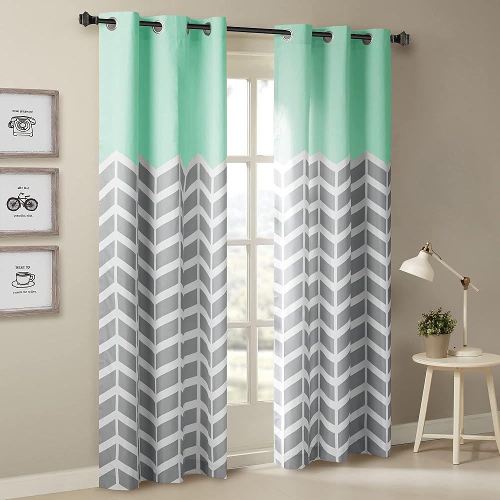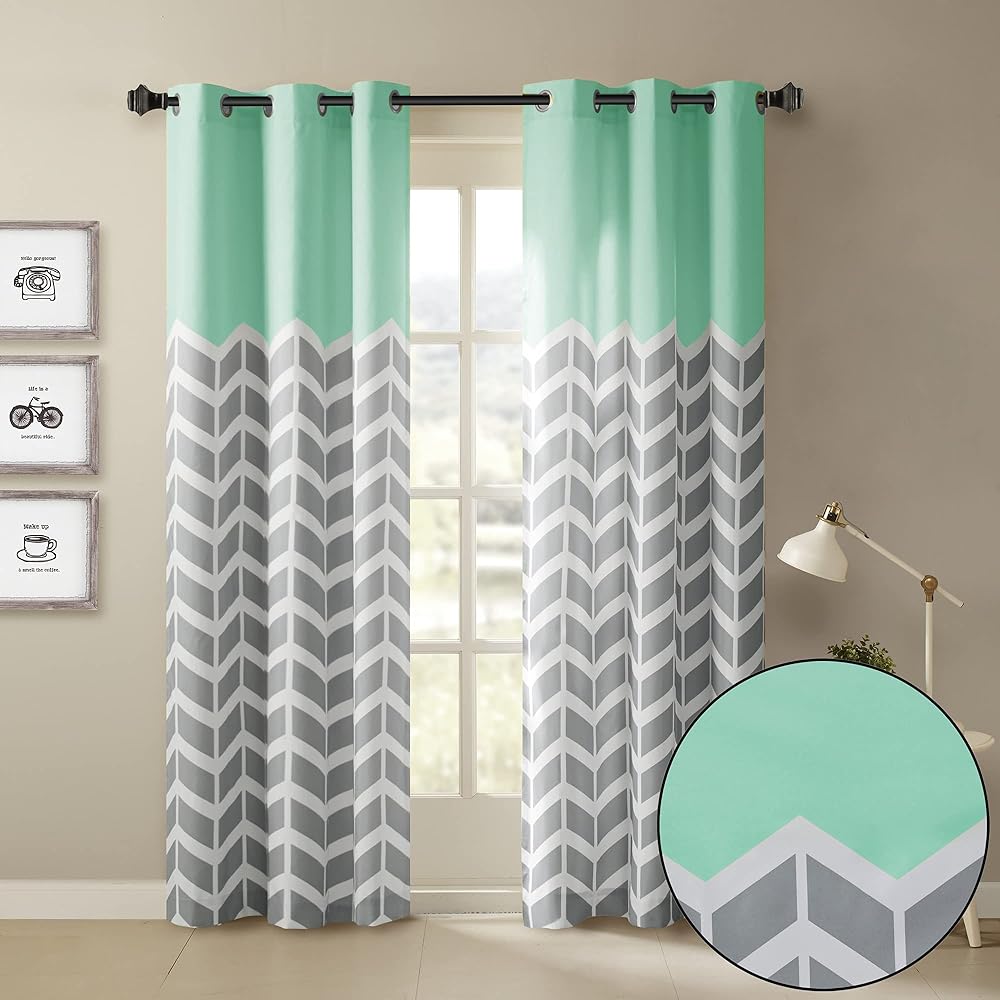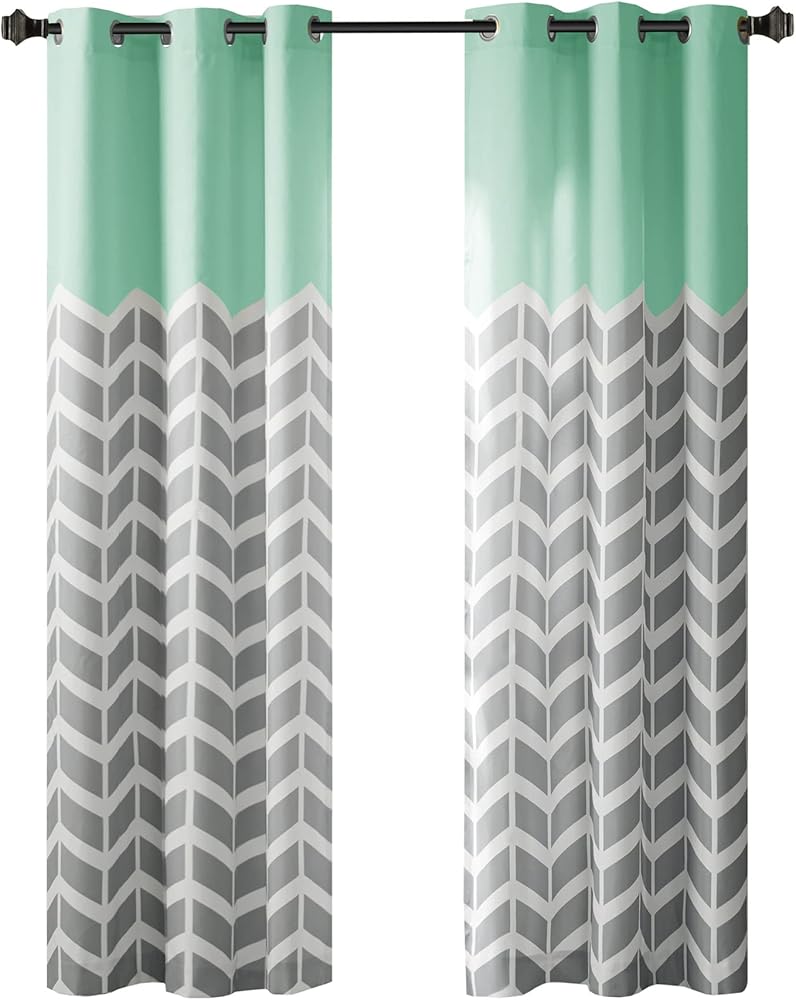 Our Intelligent Design Alex Chevron Printed Room Darkening Panel Pair adds bright color and fun style to your room. These window panels feature a contrast color chevron print with solid top border, for a refreshingly modern update that pops! Each window curtain is made from a polyester microfiber for easy care; this window panel provides a room darkening effect to soften harsh sunlight, while also serving as an effective barrier to dampen outside noise. Finished with silver grommet tops making it easier to hang, open, and close panels throughout the day. Fits up to a 1.25" diameter rod.