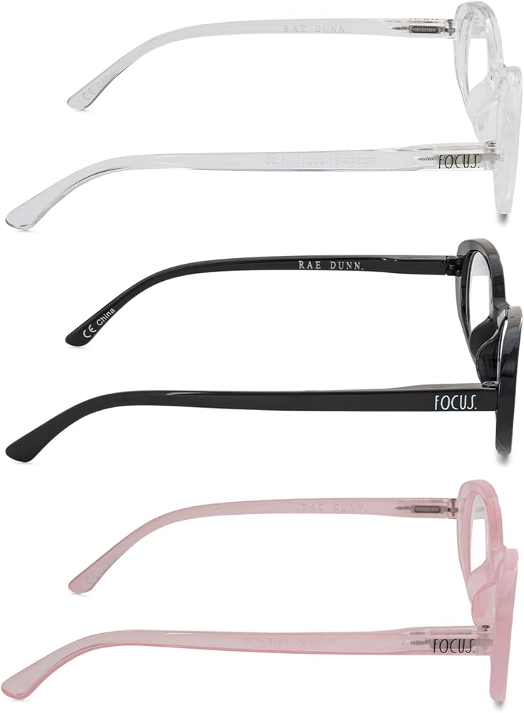 "Rae Dunn is a renowned clay artist based in the San Francisco Bay Area in California. While she is most well known for her housewares collections, Rae's distinctive longhand wordmarks now touch many product categories and are available nationwide. Rae Dunn Eyewear is stylish, versatile and functional. The highly sought after collection, dubbed Studio Hues, was inspired by the artist's signature aesthetic, striking a thoughtful balance between playfulness and simplicity. The move into Eyewear was motivated by the artist's personal need for reading glasses in her everyday life. Rae tailored every detail of the collection down to the packaging. "Reading glasses are a crucial part of my everyday life—in fact, I can't function without them. I keep them everywhere and love that each pair sets a different tone depending on my mood. I'm thrilled to offer that kind of variety to others, with a unique style that celebrates simplicity, joy, and the beauty of imperfection.” -Rae Dunn Each frame features one of Rae's signature hand-written style word marks, while the matching cases bear complimentary embossed phrases. The readers and blue light blocking glasses are sold in single, double, and triple packs; lens magnifications range from 0.00+ to 2.50+.