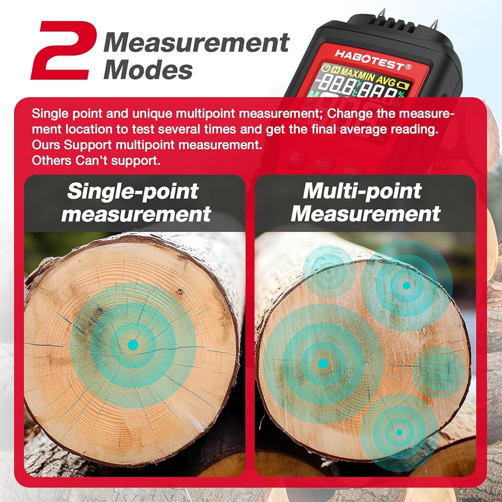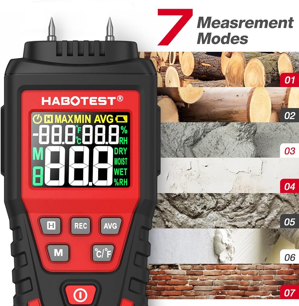 أداة دقيقة واحترافية: يتميز جهاز قياس الرطوبة HABOTEST بوضعين للكشف ووضعين للكشف عن المواد بدقة 0.1%. في وضع الدبوس، تتراوح نسبة المواد الخشبية من 6% إلى 60%، وتتراوح مواد البناء من 0% إلى 33%، مع نطاق خطأ +/-2%. في وضع المسح بدون دبابيس، تتراوح نسبة كل من الخشب ومواد البناء من 0% إلى 33%، مع نطاق خطأ يصل إلى +/- 4%. بالإضافة إلى ذلك، منتجنا يقدم 7 موازين معايرة لقياس أنواع مختلفة من الخشب.