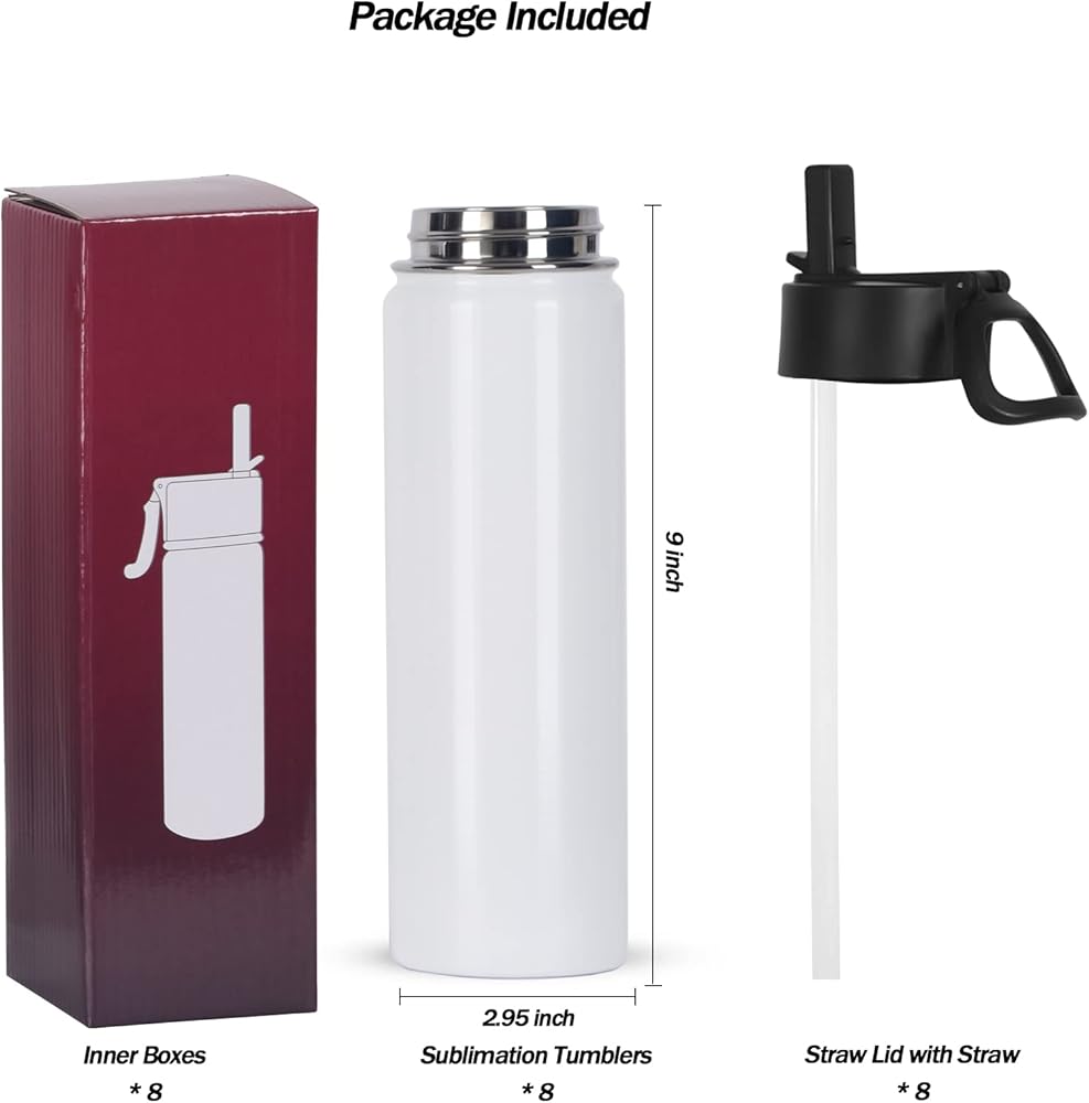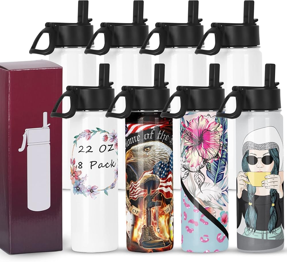 فراغات زجاجات المياه الرياضية بالتسامي (8 عبوات)، أكواب التسامي فارغة 22 أونصة، قارورة زجاجة رياضية من الفولاذ المقاوم للصدأ مع قش ومقبض محمول، معبأة بشكل فردي