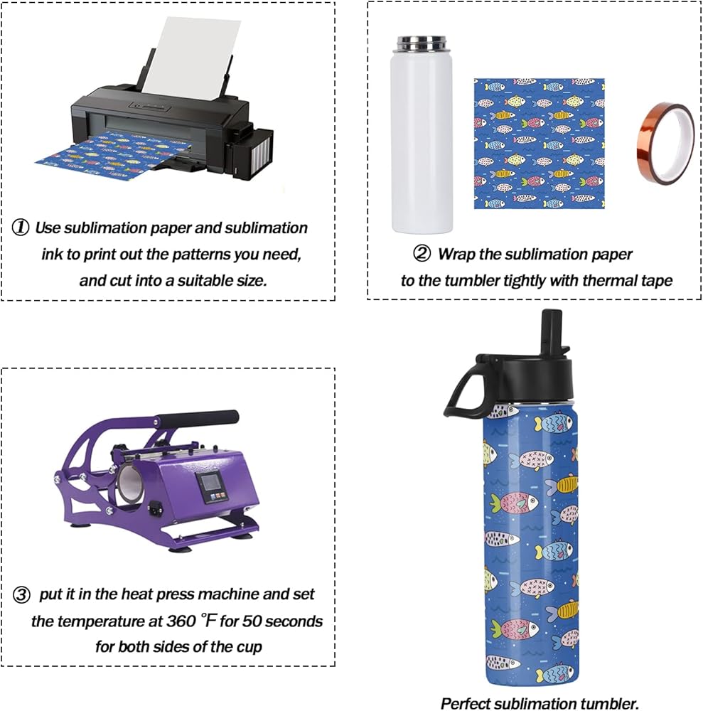 عملية التسامي: 1. اختر الصورة التي تحتاجها وقم بطباعتها (تأكد من أن الحجم مناسب لجسم الكوب)، 2. لف ورق التسامي المطبوع على زجاجة ماء التسامي بشريط حراري، 3. استخدم آلة الضغط الحراري عند درجة حرارة 360 فهرنهايت لمدة 50 ثانية (الفرن 360 فهرنهايت، 300 ثانية)، ستحصل على زجاجة مياه رياضية جميلة.
