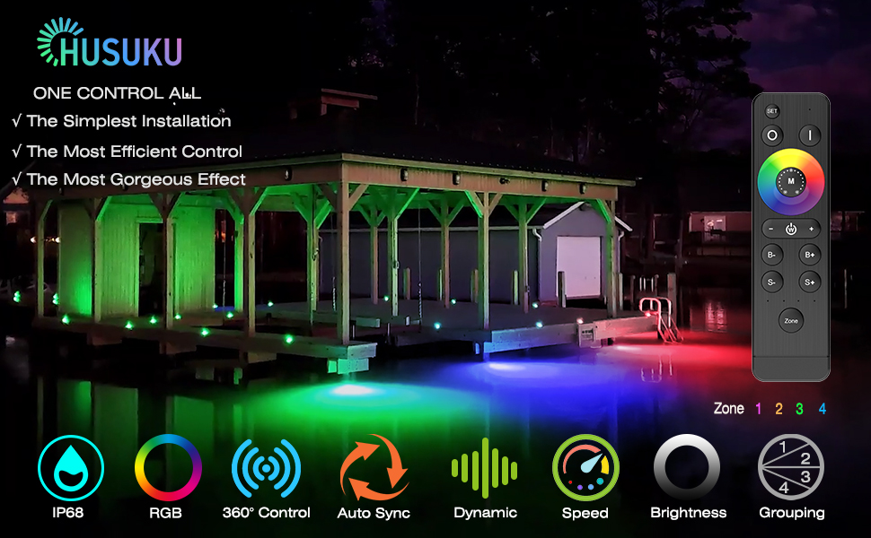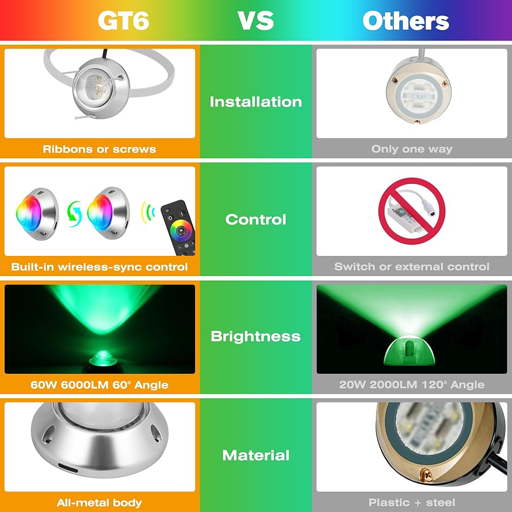 HUSUKU GT6 أضواء حوض القارب تحت الماء، 2x6000LM، زاوية شعاع 60 درجة، 12 فولت RGB 60 وات IP68 مقاومة للماء، جسم معدني بالكامل، مجموعة لاسلكية ومزامنة لرسو السفن/البحرية/القارب/عائم/صيد الأسماك، حامل سطحي
