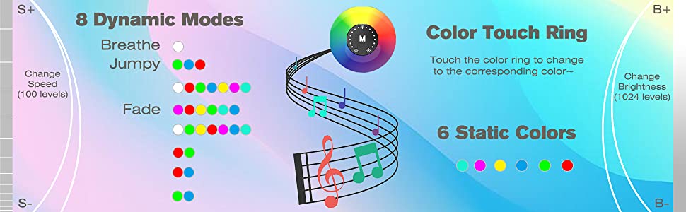 • 【جهاز تحكم واحد عن بعد 】التجميع والتحكم اللاسلكي √ أوضاع ديناميكية وثابتة متعددة √ حلقة لمس ملونة √ تغيير السرعة والسطوع قابل للتعديل √ تعديل بدون خطوات √ ذاكرة إيقاف التشغيل √ رمز تحكم قابل للنسخ √ شكل مريح √ قاعدة تحكم مريحة √ يمكن التحكم في لون RGB √