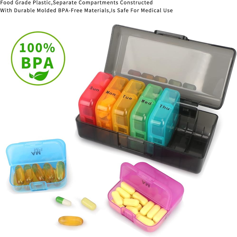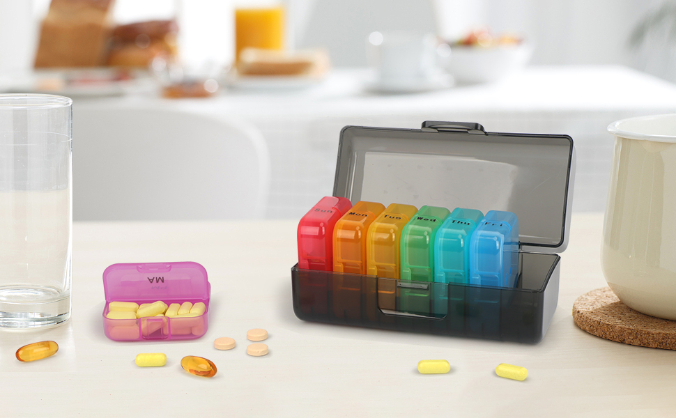 【مادة خالية من البيسفينول A】مادة منظم حبوب الدواء لمدة 7 أيام مصنوعة من مادة البولي بروبيلين الملائمة للطعام، وخالية من البيسفينول A، لذلك يمكنك وضع الدواء بأمان للتخزين.