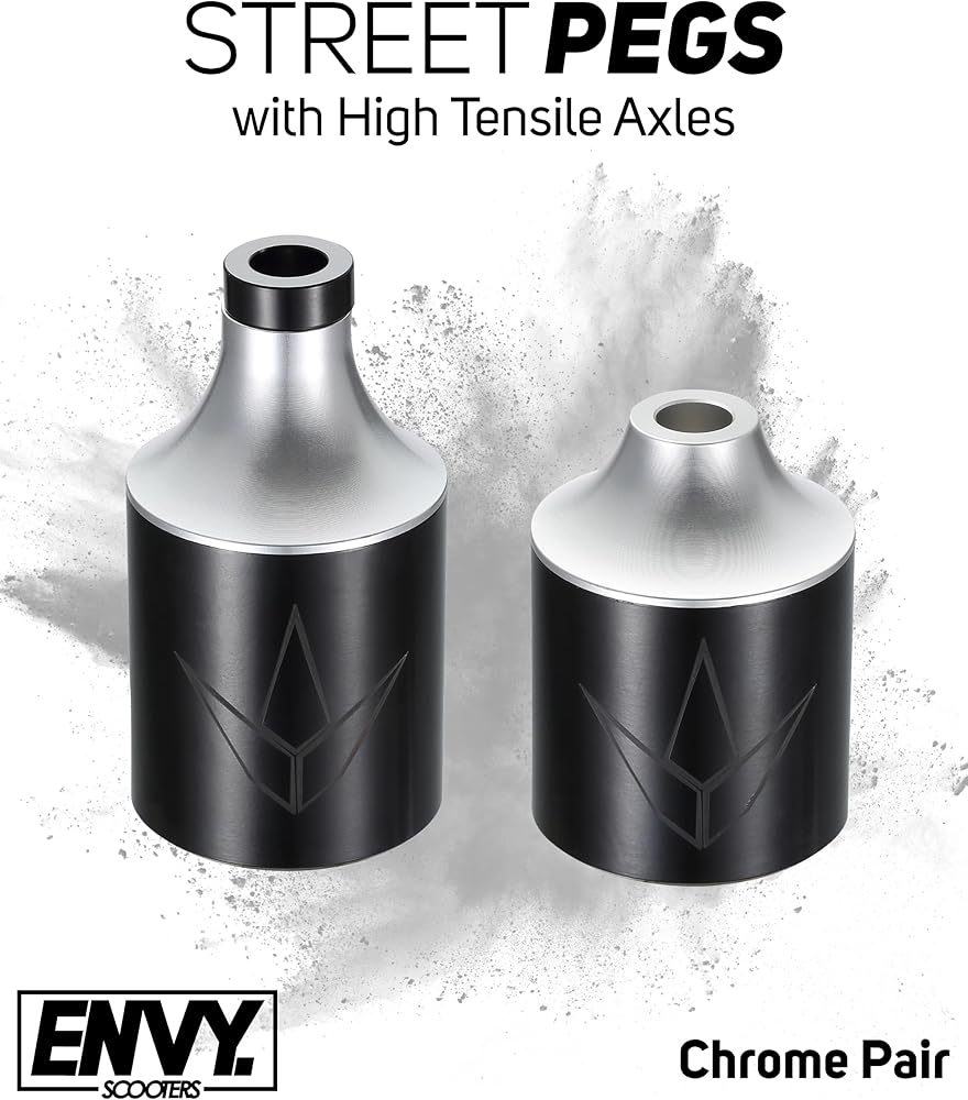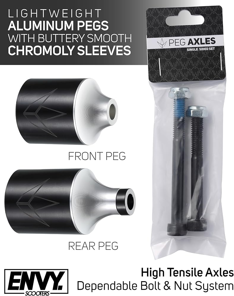 Everything you need to install up to 2 pegs on your Envy scooter or other pro scooter. Best for street riders looking to upskill their tricks using larger pegs! Made with High Density Aluminum core and durable yet buttery smooth Chromoly Sleeve, these pegs are a suitable choice for many riders, and especially street scooter riders. This set includes High Tensile Axles for a single sided setup, and exactly what you need to install pegs and get riding. So why wait? Don't settle for any other, our Envy quality is trusted by thousands of scooter riders around the globe.
