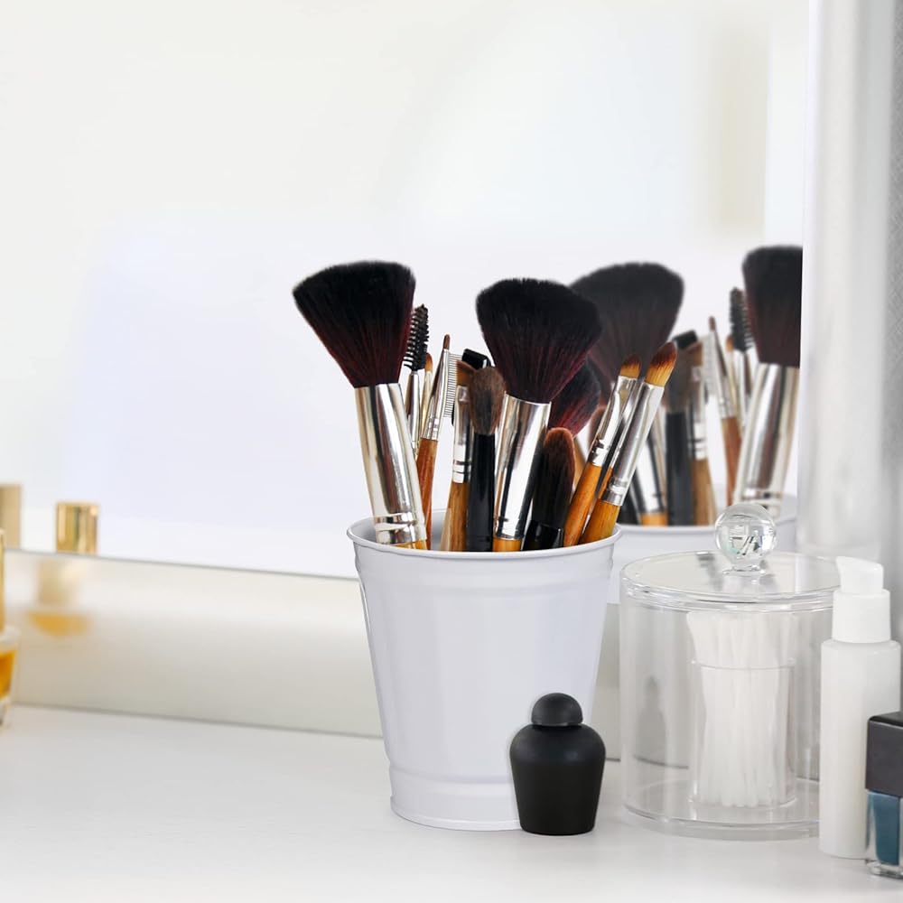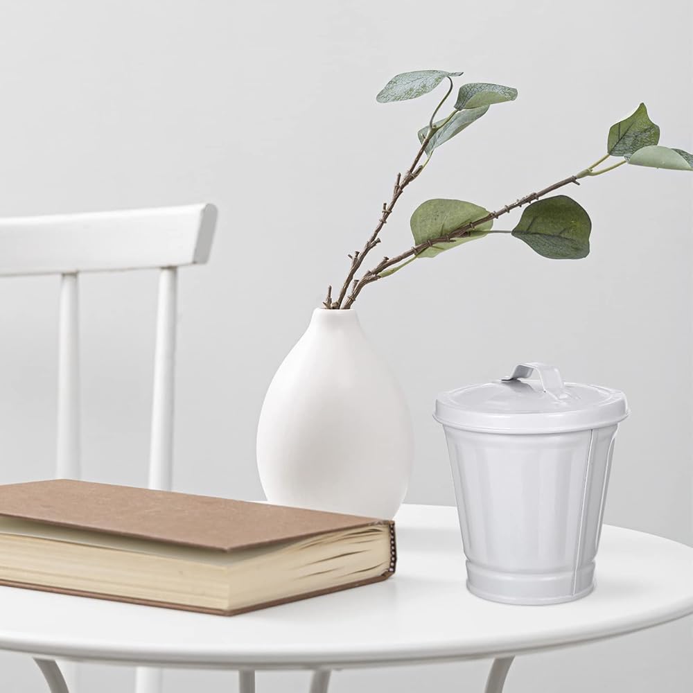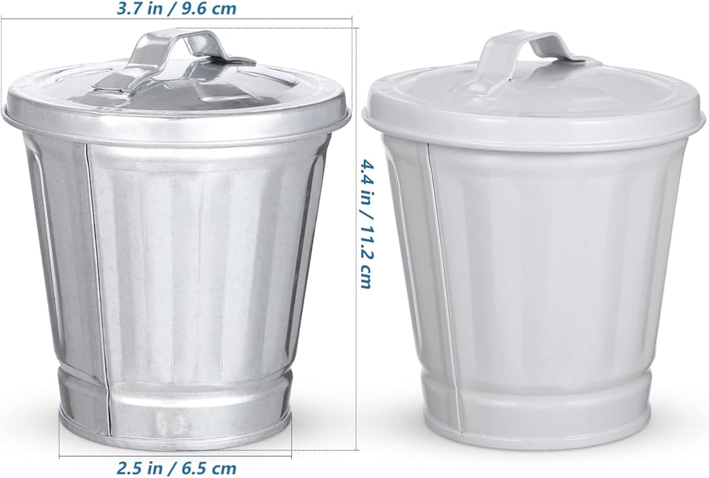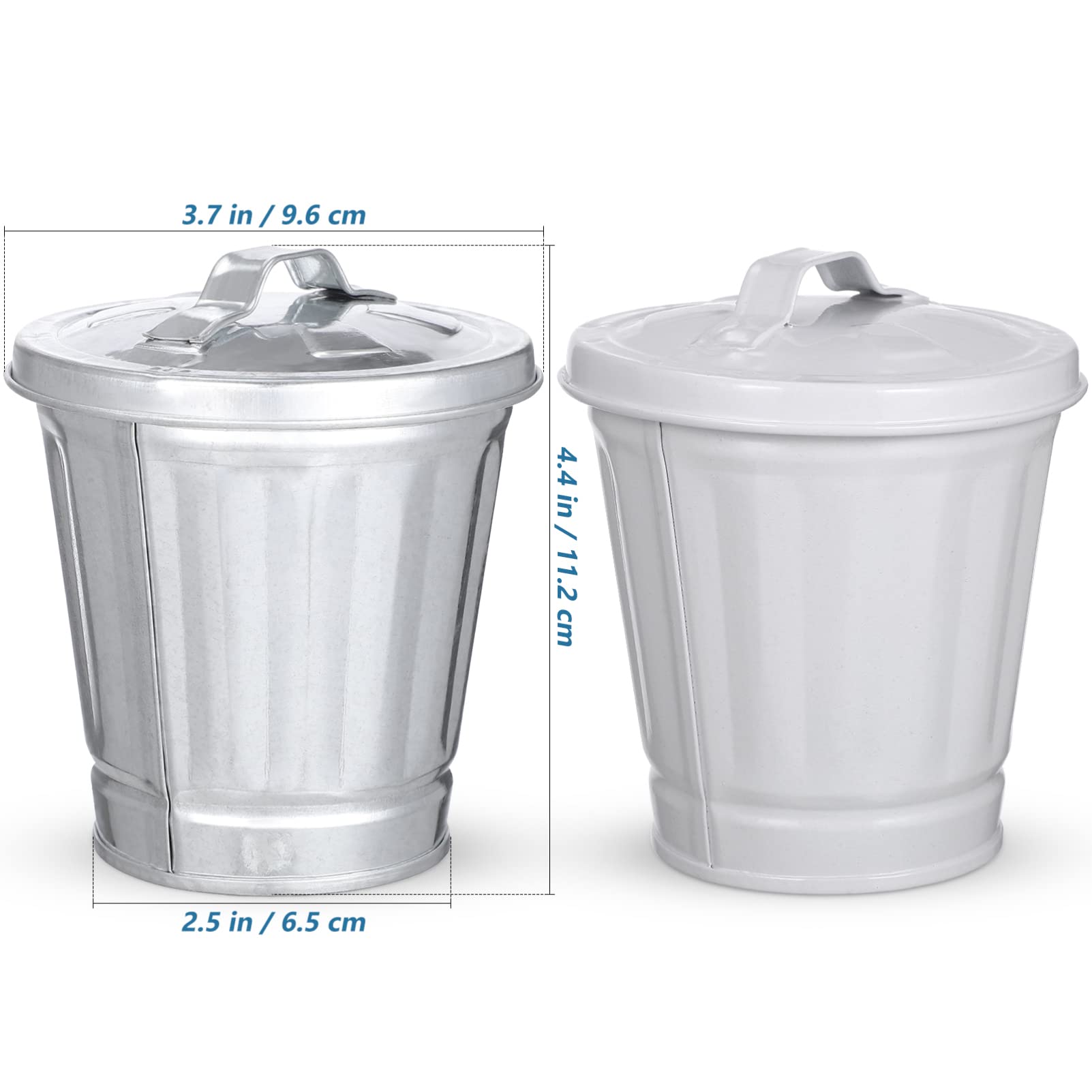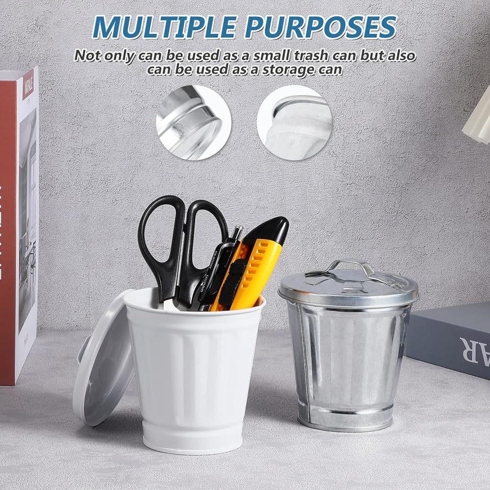 صناديق قمامة صغيرة معدنية من Alipis، صناديق قمامة سطح المكتب، فرشاة مكياج، صندوق تخزين أقلام رصاص، سلة مهملات صغيرة مع غطاء للمكتب المنزلي (فضي + أبيض)