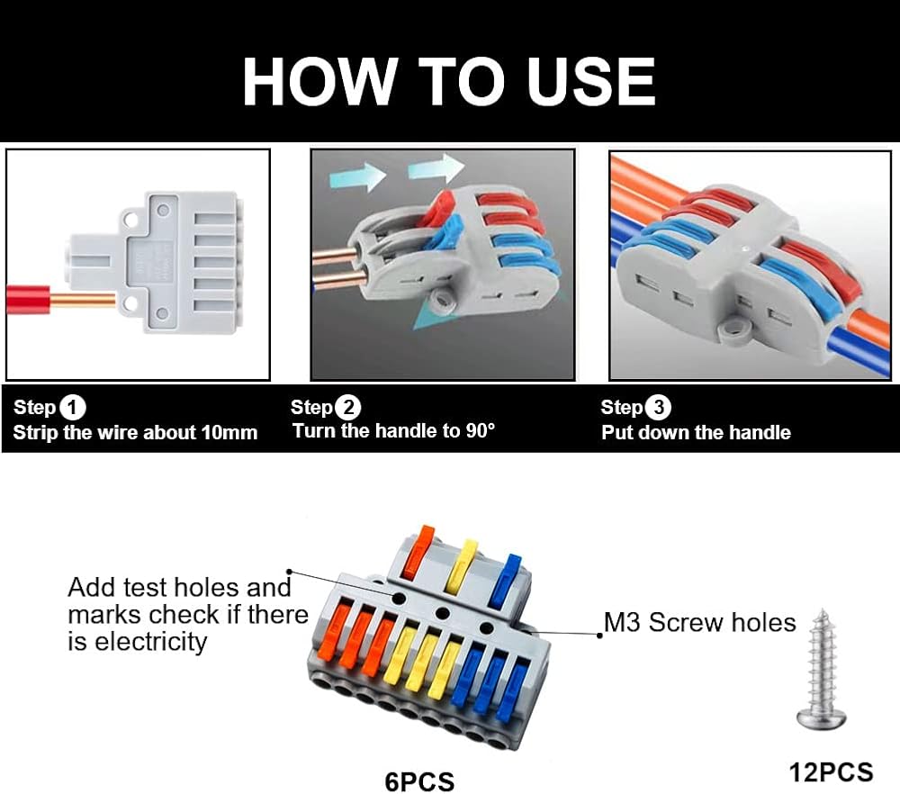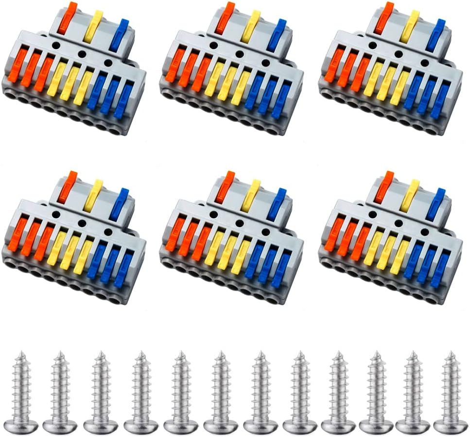 【Package includes】: 10 PCS 3 in 6 Out Quick Wiring Connector, Suitable for hard wire 0.08-4.0mm²/ AWG28-12, soft wire 0.08-2.5mm²/AWG28-14. connectors are widely applied for motor, electrical control, power supply, home appliance, machinery and other electrical connections.