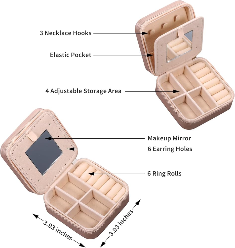Large Capacity Jewelry Cases: This jewelry organizer box includes 6 ring rolls, 3 necklace hooks,1 mini vanity mirror, 6 earring holes, and 4 divided compartments to protect your precious pieces. This travel jewelry box will keep your jewelry organized, and prevent your necklace from tangling so that you can quickly and easily find rings, earrings, and other beautiful jewelry. The built-in mirror makes it easy to make up at any time. It's a great gift for moms, stepmoms, or mother-in-laws.