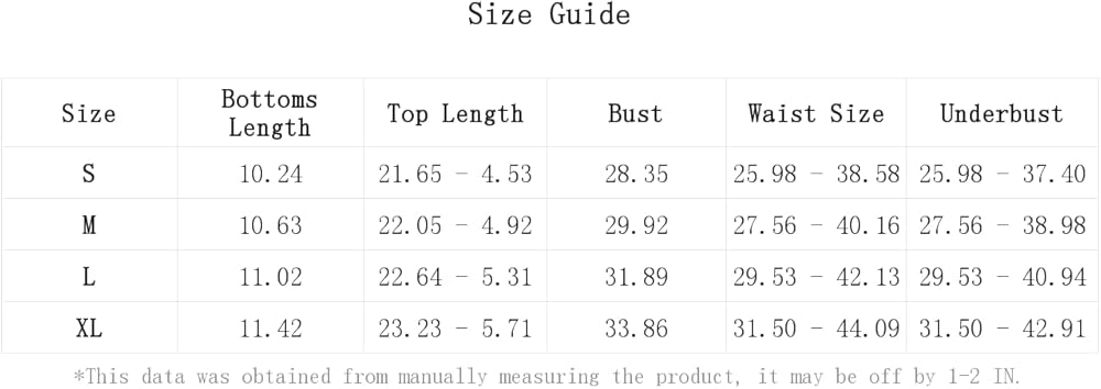 S:Bust:28.3IN,Top Length:21.7/4.5IN,Underbust:26.0-37.4IN,Bottoms Length:10.2IN,Waist Size:26.0-38.6IN