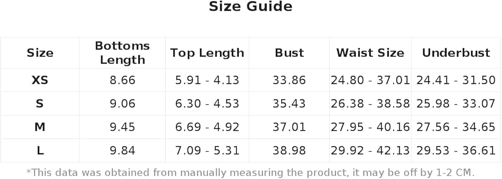 XS:Bust:33.9IN,Top Length:5.9/4.1IN,Underbust:24.4-31.5IN,Bottoms Length:8.7IN,Waist Size:24.8-37.0IN